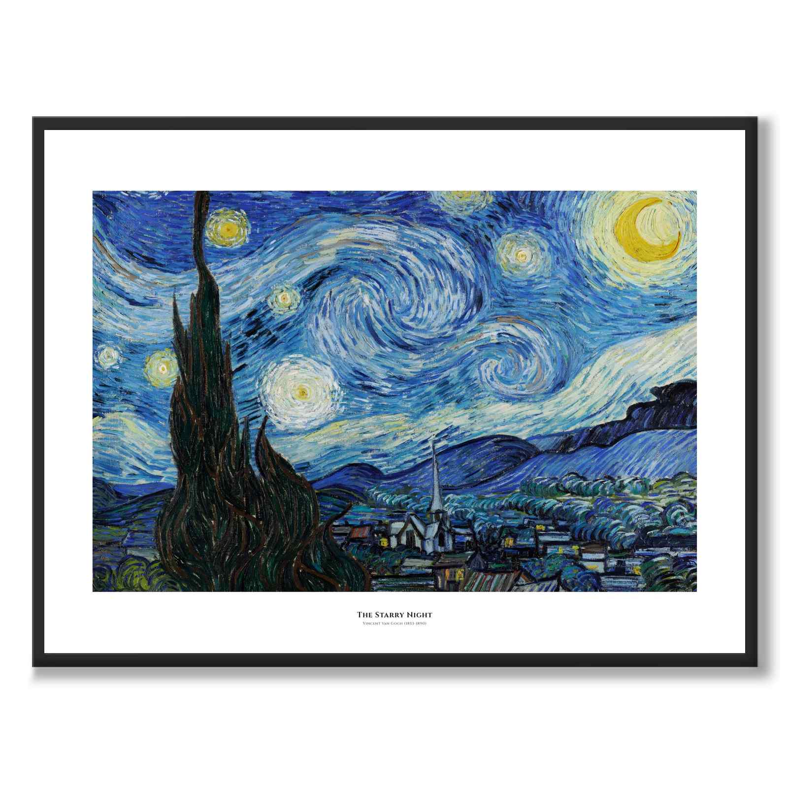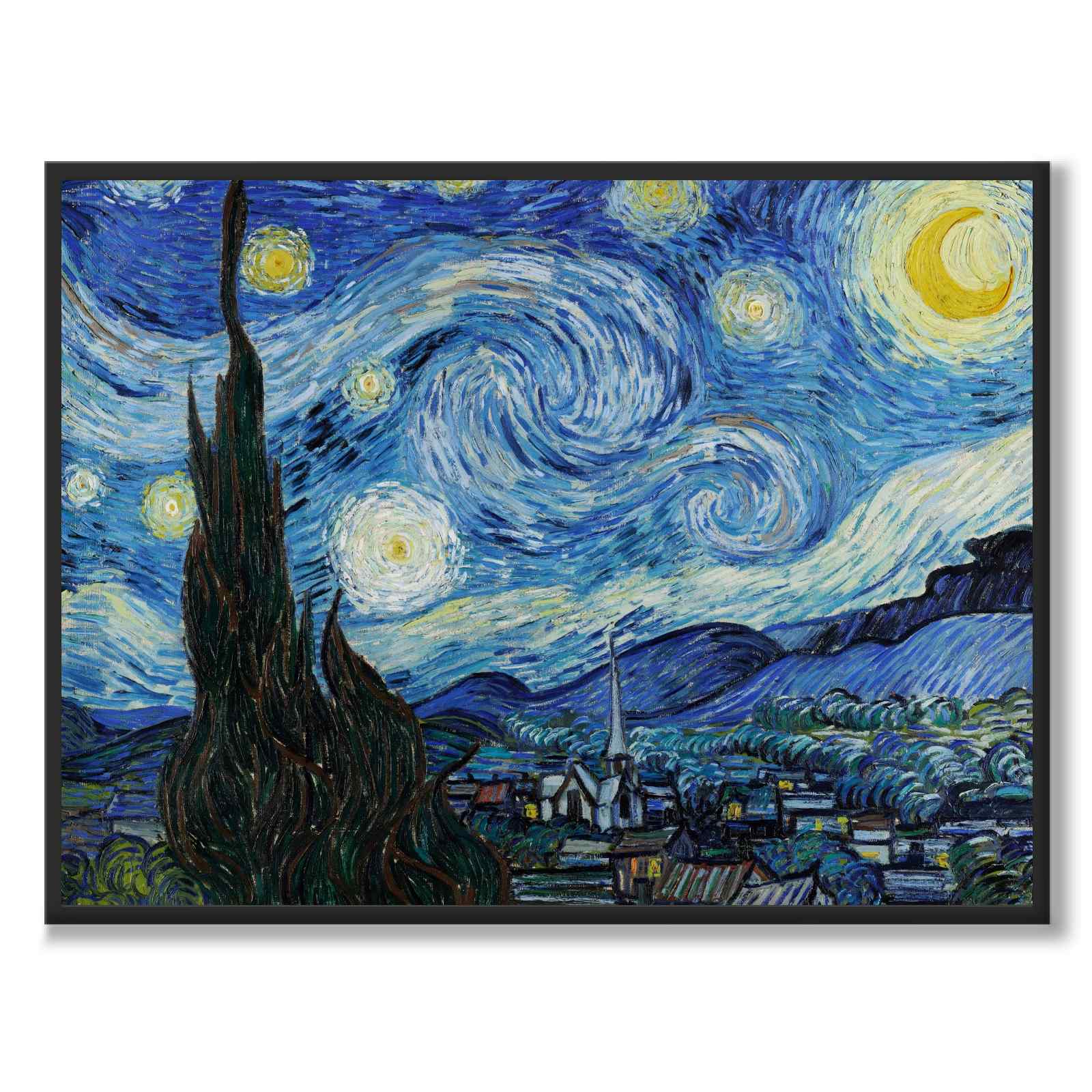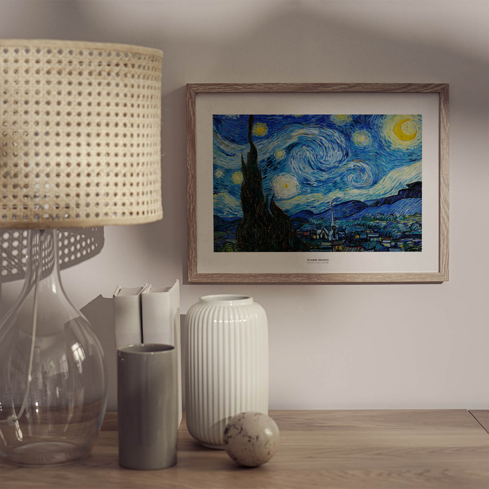 Plakat med det verdenskjente motivet Stjernenatten fra 1889 av impresjonistkunstneren Vincent van Gogh. Motivet representerer utsikten fra van Goghs vindu på mentalsykehuset hvor han ble innlagt etter å ha skadet seg året før.