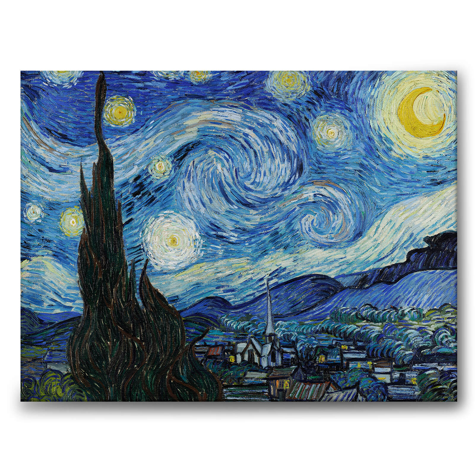 Lerret med det verdenskjente motivet Stjernenatten fra 1889 av impresjonistkunstneren Vincent van Gogh. Motivet representerer utsikten fra van Goghs vindu på mentalsykehuset hvor han ble innlagt etter å ha skadet seg året før.