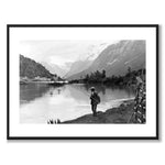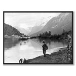 Plakat med et vakkert fotografi av en mann som står med lang fiskestang, ved Stavangerfjord . Bildet er tatt av den norske fotografen Anders Beer Wilse.