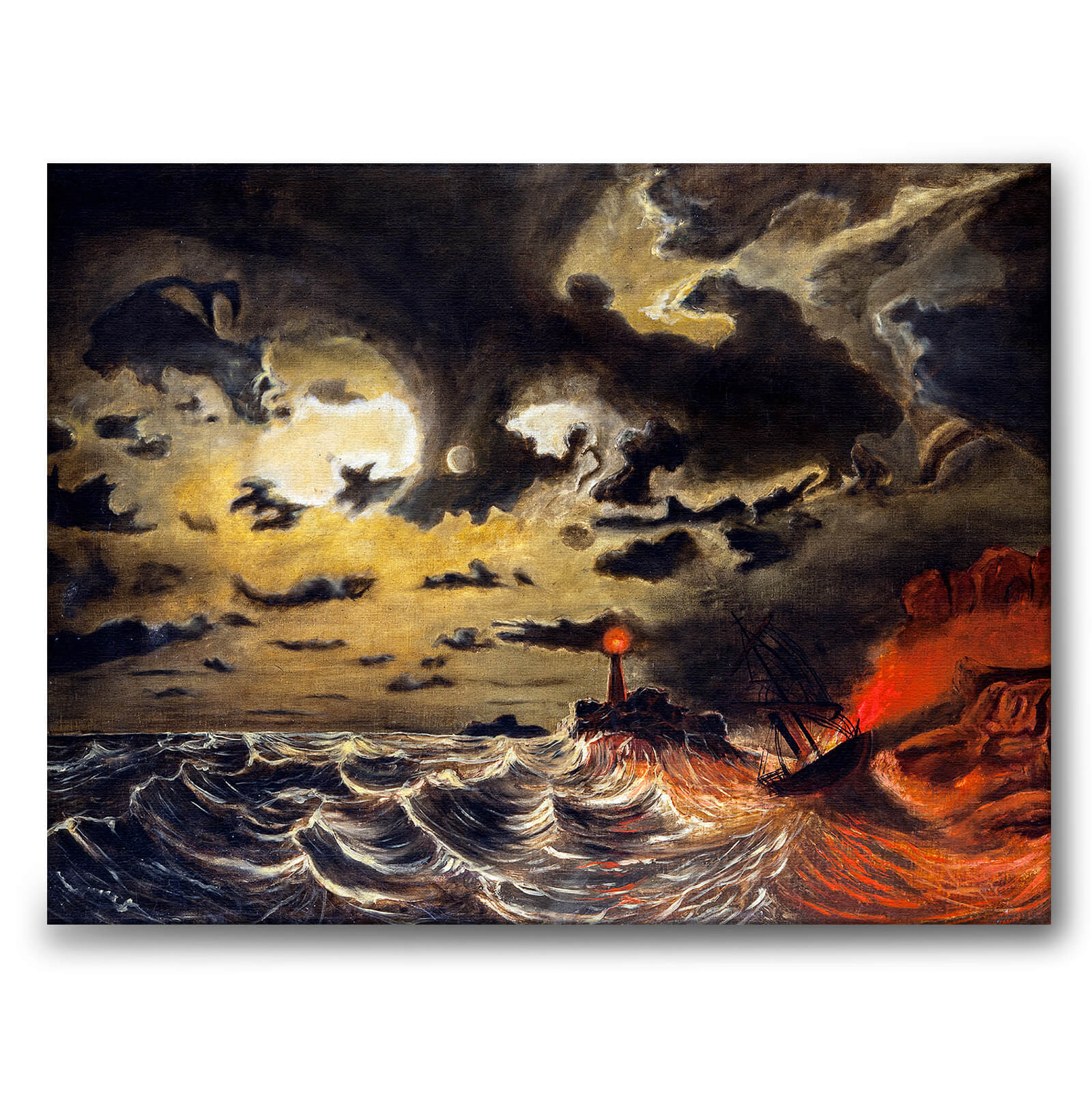 Lerret med det vakre maleriet Steamer in flammes, eller Brinnande ångbåt på svensk. Maleriet ble laget på midten av 1800-tallet av Marcus Larson, en svensk maler.