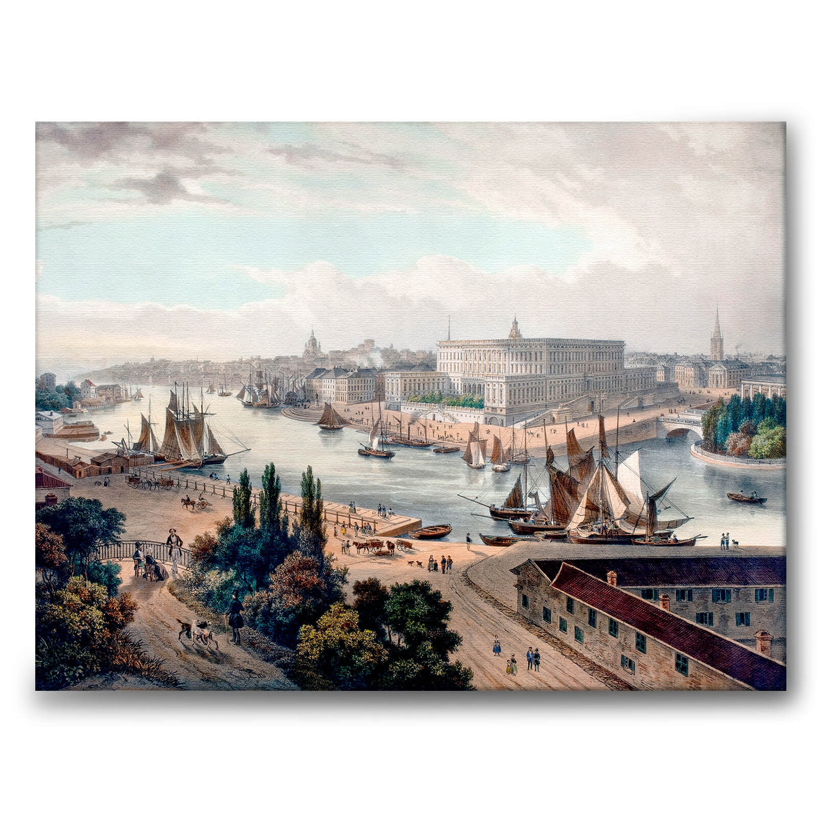 Lerret med maleri fra 1840-tallet med utsikt over slottet, Skeppsbron og Skeppsholmen. Kunstneren Johan Henric Strömer har stått og malt maleriet på Fersenska terrassen, som ligger mellom Kungsträdgården og Grand Hotel.