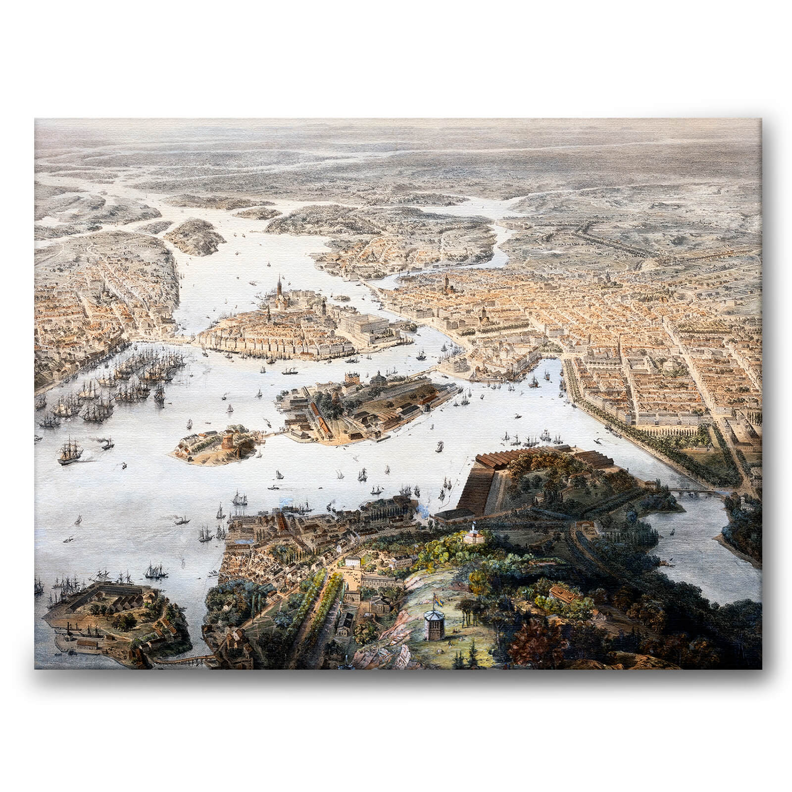 Lerret med maleri fra 1860-tallet med panorama over Stockholm eller Fogelvue over Stockholm som bildet også kalles.