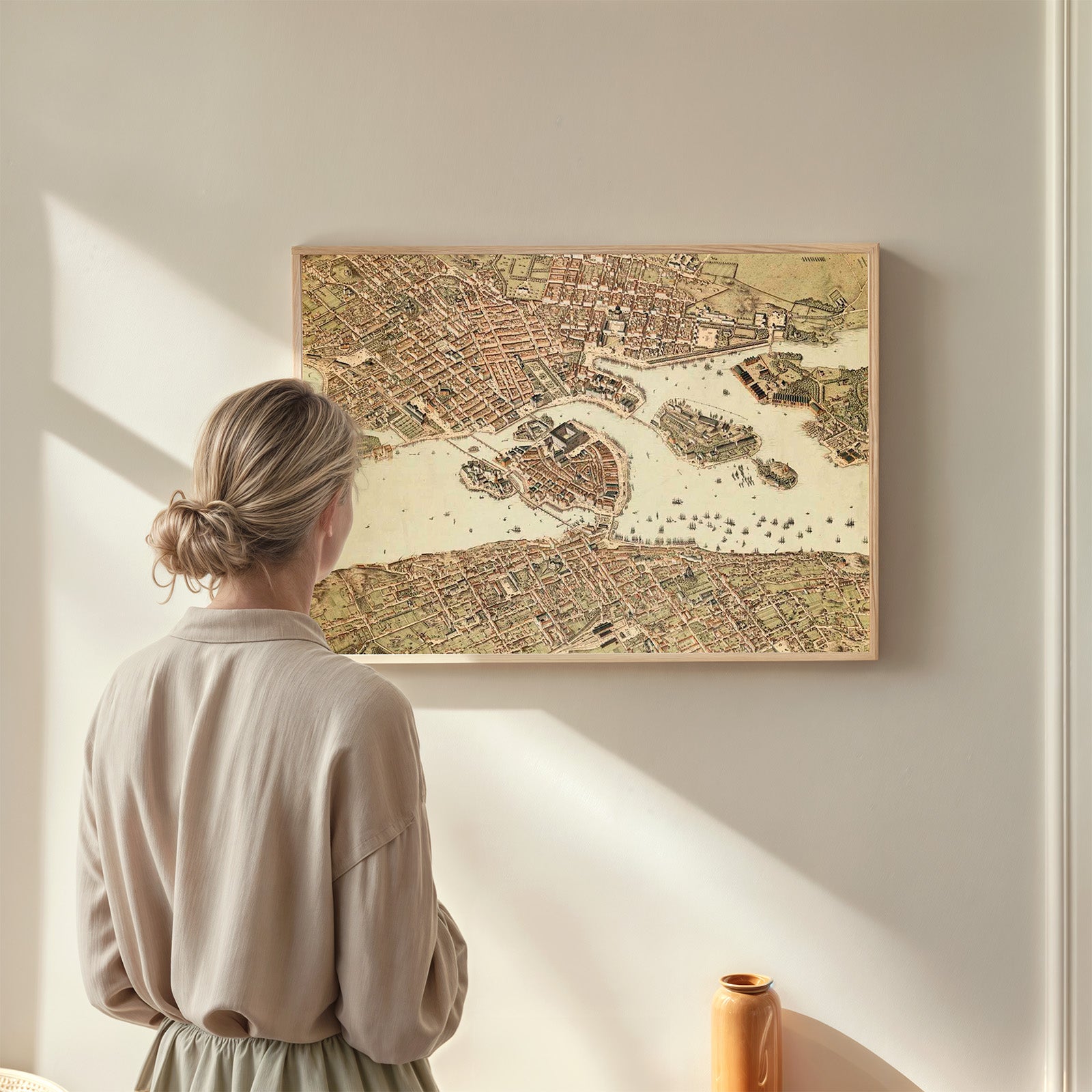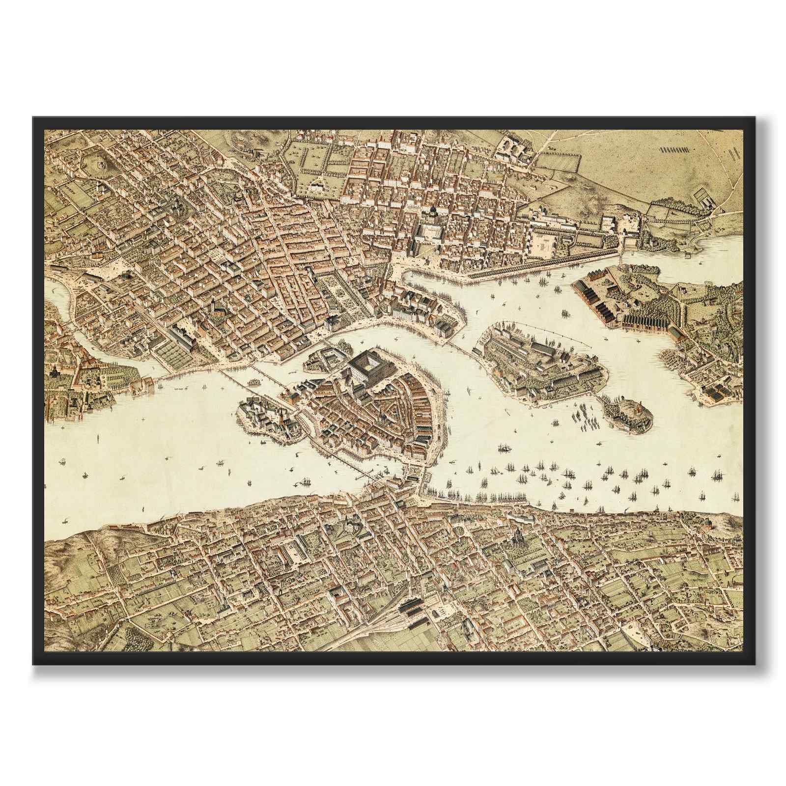 Kartet viser byen sett fra luften og de mange vannveiene som omgir byen, som innsjøen Mälaren og Saltsjøen. Den viser de sentrale delene av Stockholm med middelalderbystrukturen, og du kan skimte områder som Gamla Stan. I kantene av kartet kan du se deler av den voksende industrien.