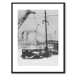 Man kan skimte silhuetten av menn som betjener havnekranen sittende på hytta og som losser eller laster varer og varer. I forgrunnen står noen tidstypiske, parkerte biler.