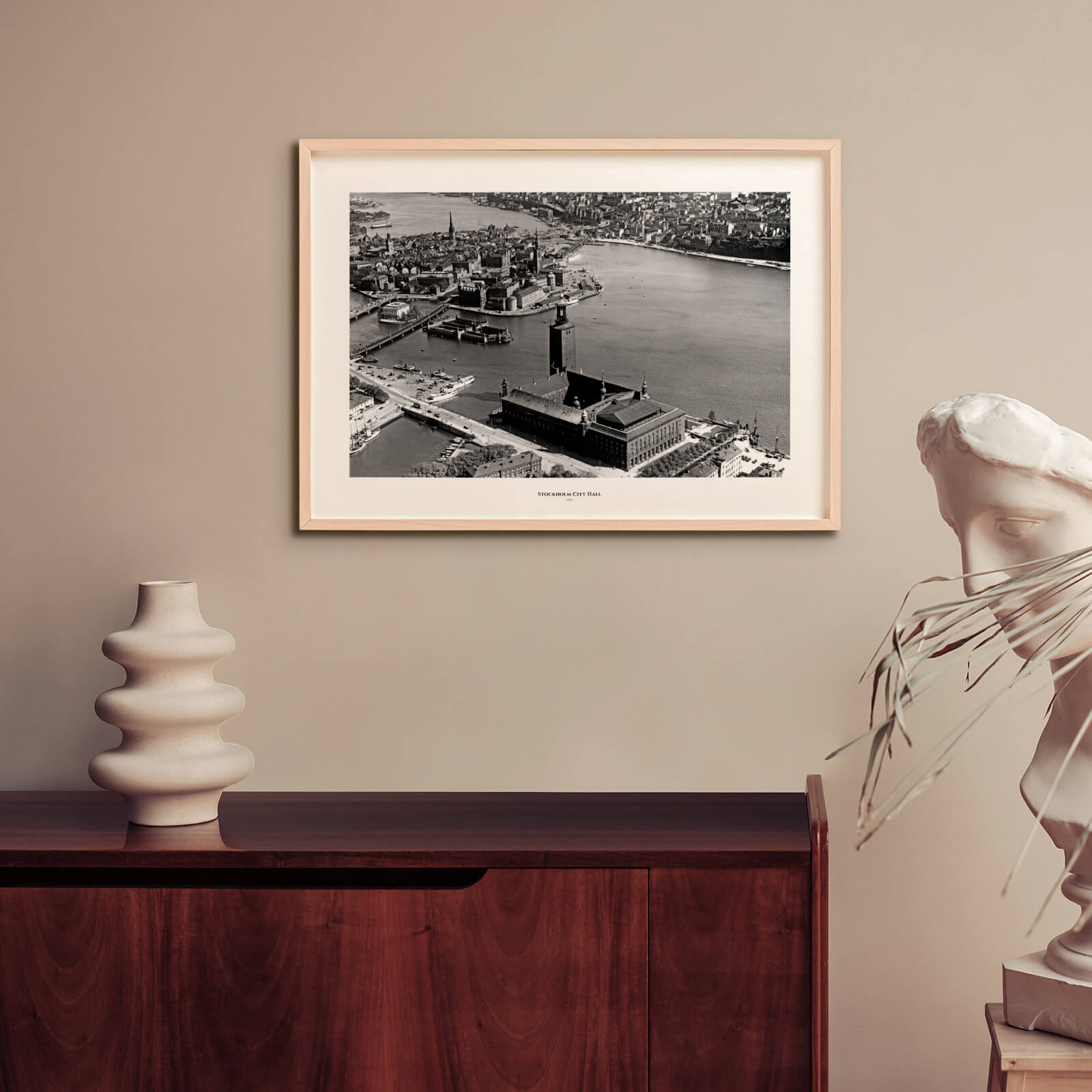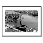 Luftfoto av Stockholms rådhus fra 1935. Bildet viser deler av Södermalm, Riddarholmen og Gamla Stan. Mellom Riddarholmen og Rådhuset kan du se Strömbadet, som du kan lese mer om her