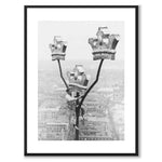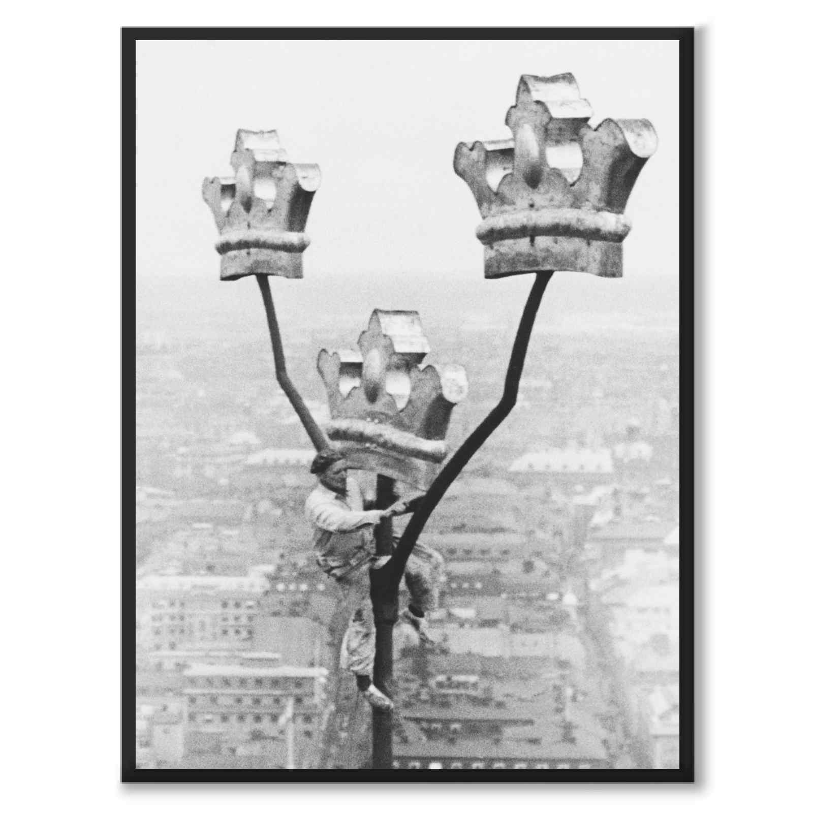 Plakat med fotografi av datidens blikkenslagere høyt oppe i Stockholms rådhuss tårnkroner.