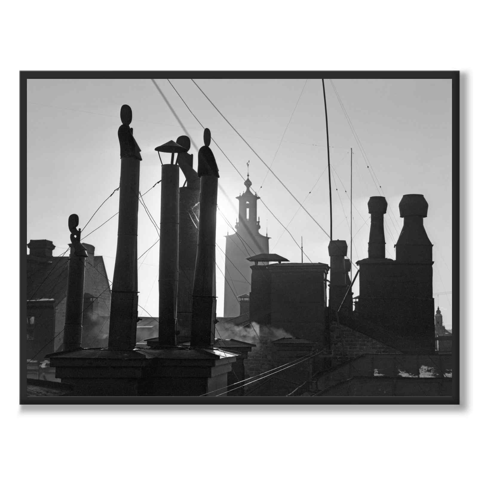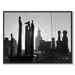 Plakat med et vakkert, gammelt fotografi fra Stockholm i 1953. Bildet er tatt over Klarakvartern og hustakene med sine skorsteiner. I bakgrunnen ruver Stockholms rådhus i solskinnet.