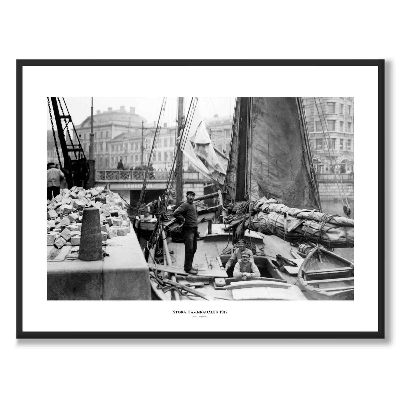 Et unikt øyeblikksbilde fra hverdagen i Gøteborg og Stora Hamnkanalen i juni 1917. På bildet ser vi en lekter lastet med belegningsstein. Gutta tar en pause i lettelse. En stor haug ligger på kaia.