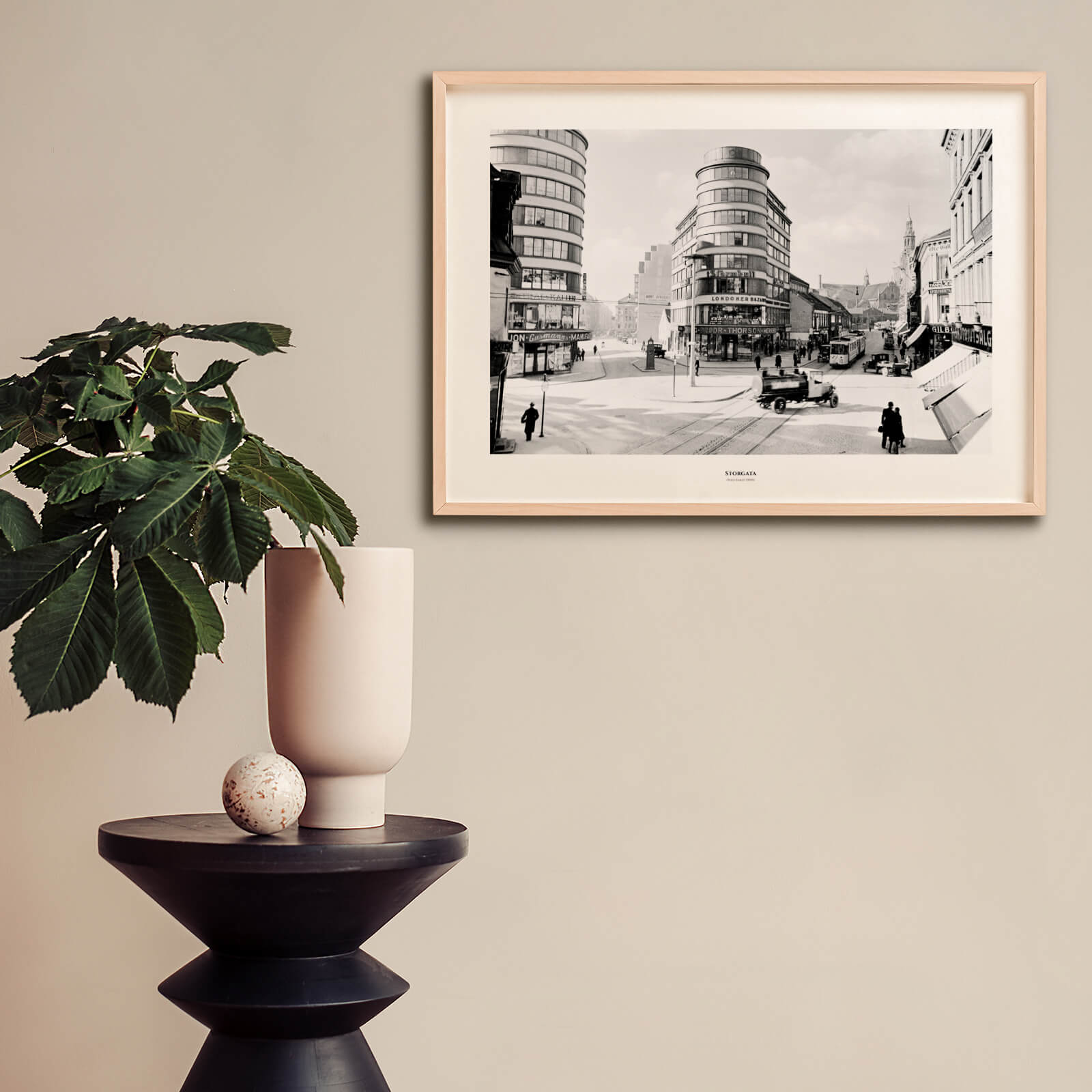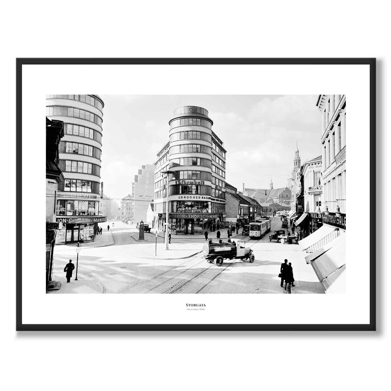 Plakat med fotografi av Storgatan i Oslo en gang på begynnelsen av 1900-tallet.