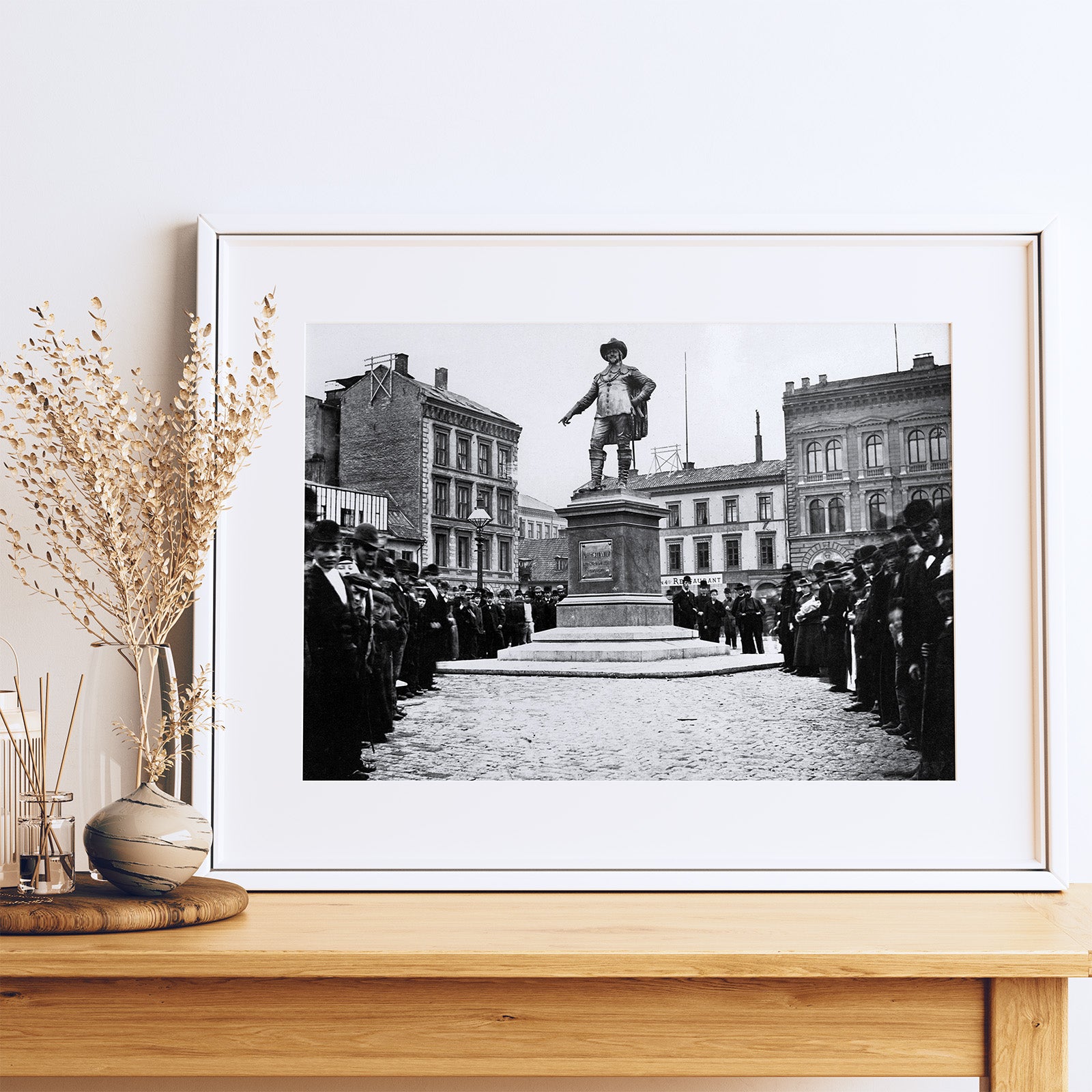 På bildet ser vi et fullsatt torg hvor folk står oppstilt rundt den nylig avdukede statuen, som hedrer Norges grunnlegger av Oslo, kong Christian IV. Bygningene i bakgrunnen gjenspeiler datidens urbane arkitektur, og scenen fanger en viktig seremoniell begivenhet.