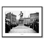 Plakat med fotografi fra avdukingen av Kristian IV-statuen på Stortorget i Oslo i 1880.
