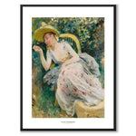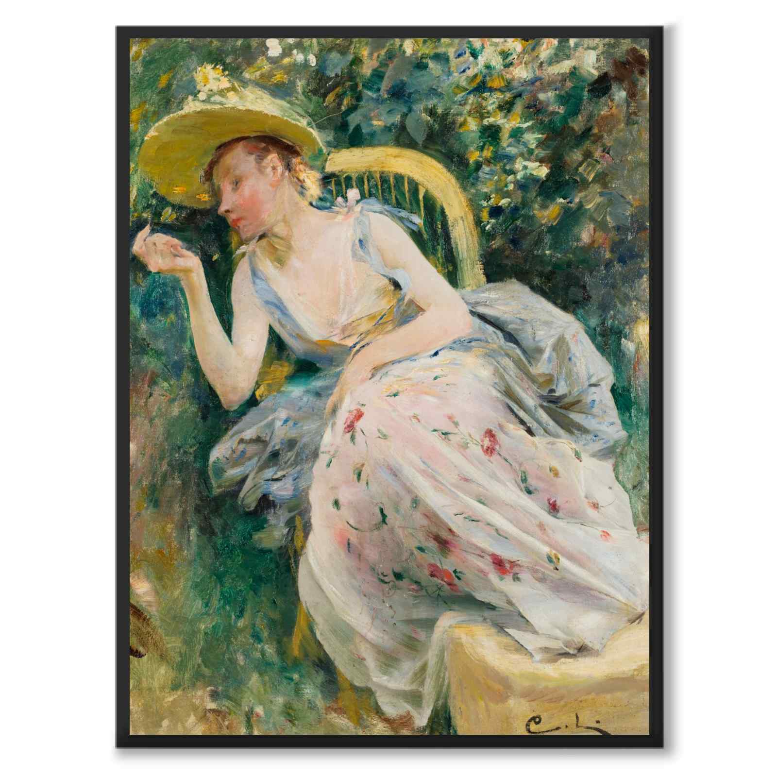 Maleriet viser en ung kvinne som sitter avslappet i en hage. Hun har på seg en blomstrende kjole og har på seg en stor hatt. Maleriet, som er fra 1888, minner om rokokkostilen som var populær på 1700-tallet og er ofte preget av elegante klær, utsmykkede rammer og en feminin estetikk.
