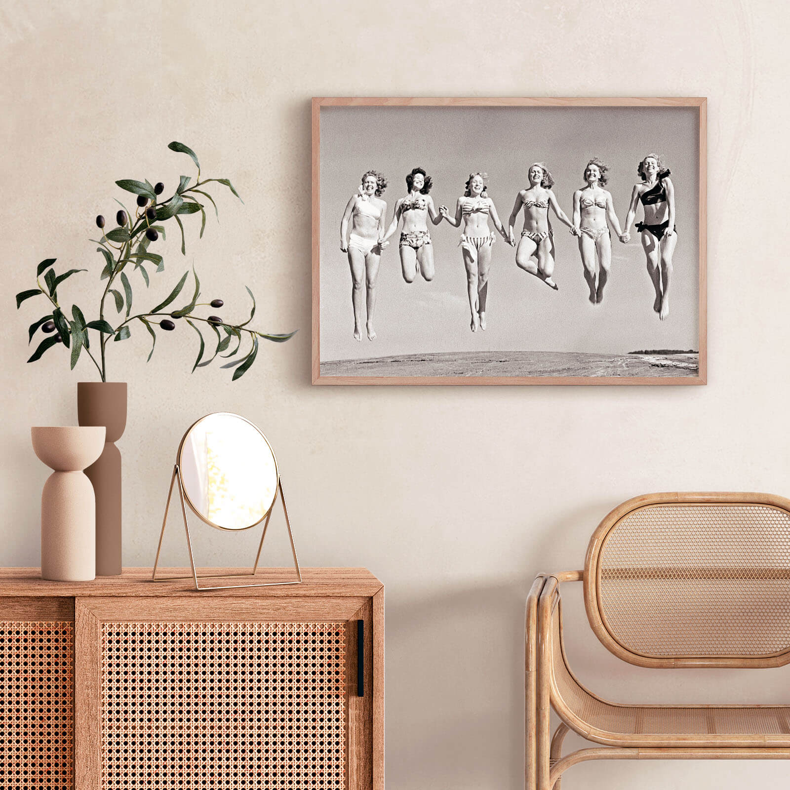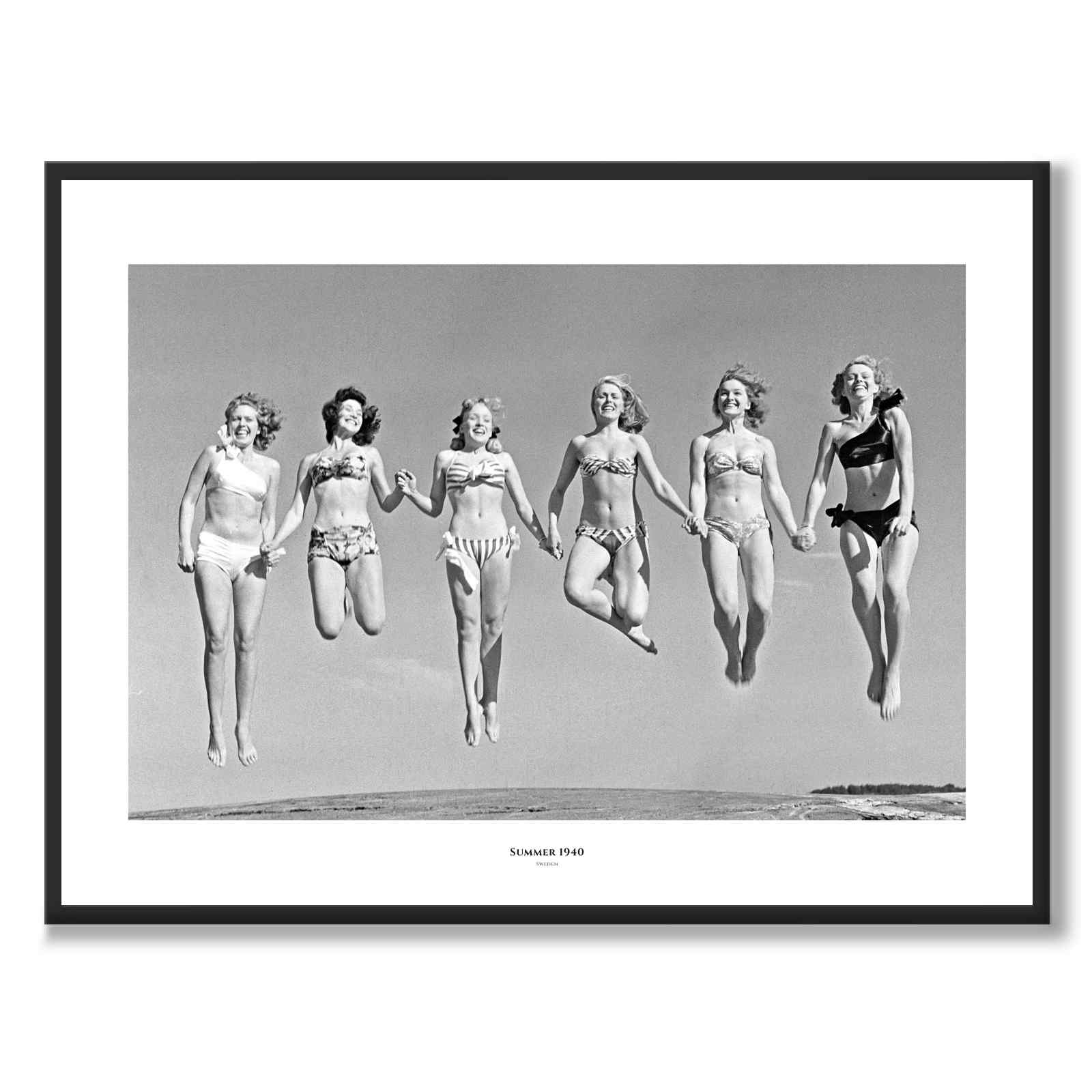 Plakat med et nydelig sommerbilde fra år 1947, tatt av KG Kristoffersson. Seks jenter i bikini hopper i luften samtidig. Helt til høyre i bildet er synlig Haide Göransson - en svensk motemodell og skuespiller.