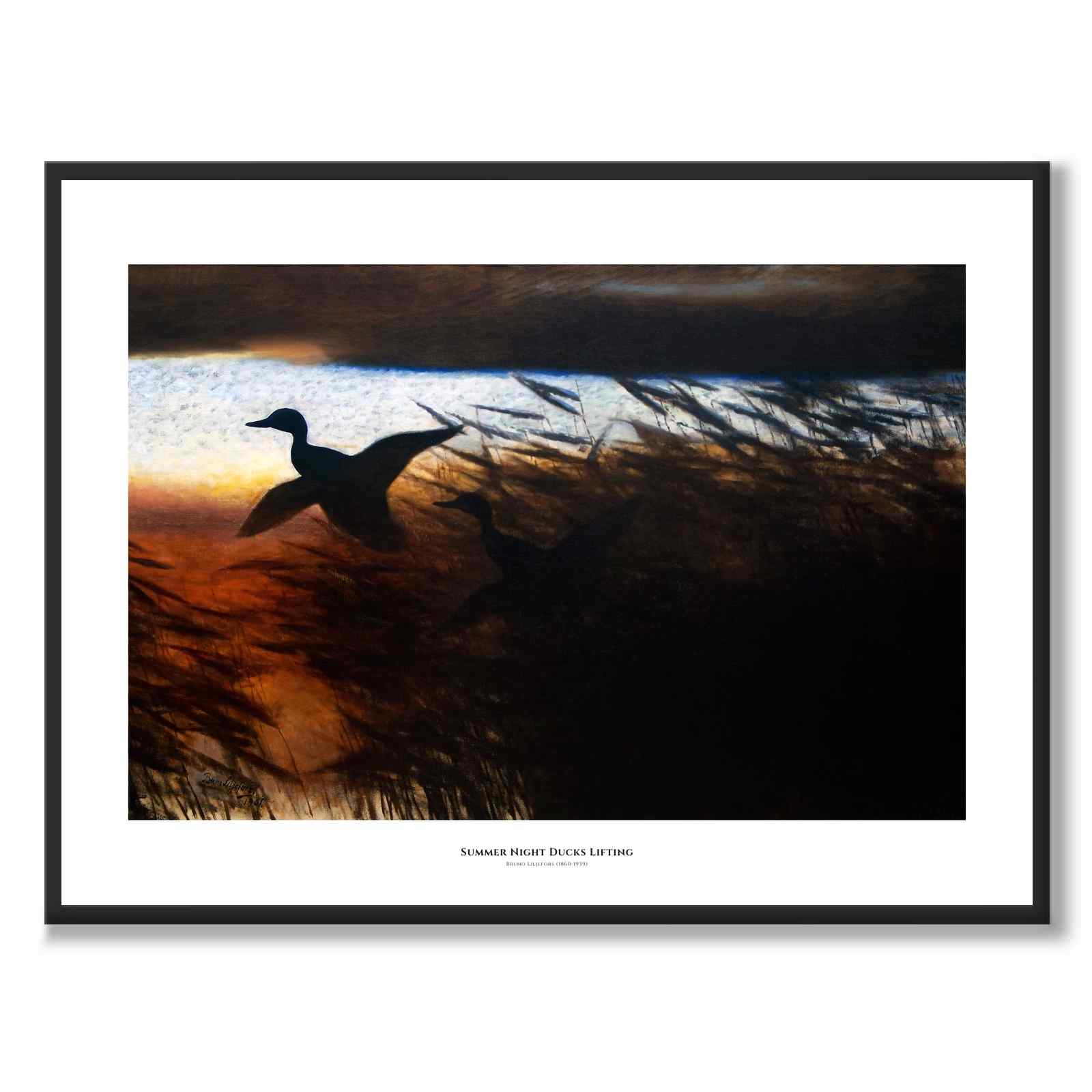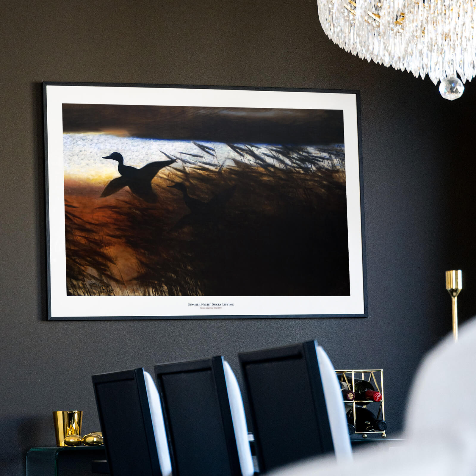 Plakat med et vakkert maleri av Bruno Liljefors fra århundreskiftet. På bildet ser vi en and som stiger opp i kveldsluften over en vakker innsjø. Du kan se det siste sollyset over vannet og vinden i sivet. Verket heter Sommernatt, løftende ender og ble malt i 1901.