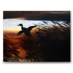 Lerret med vakkert maleri av Bruno Liljefors fra århundreskiftet. På bildet ser vi en and som stiger opp i kveldsluften over en vakker innsjø. Du kan se det siste sollyset over vannet og vinden i sivet. Verket heter Sommernatt, løftende ender og ble malt i 1901.