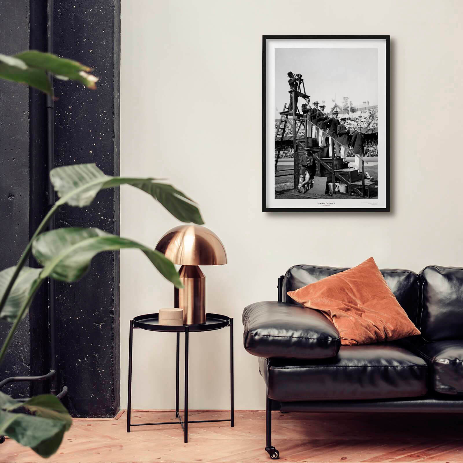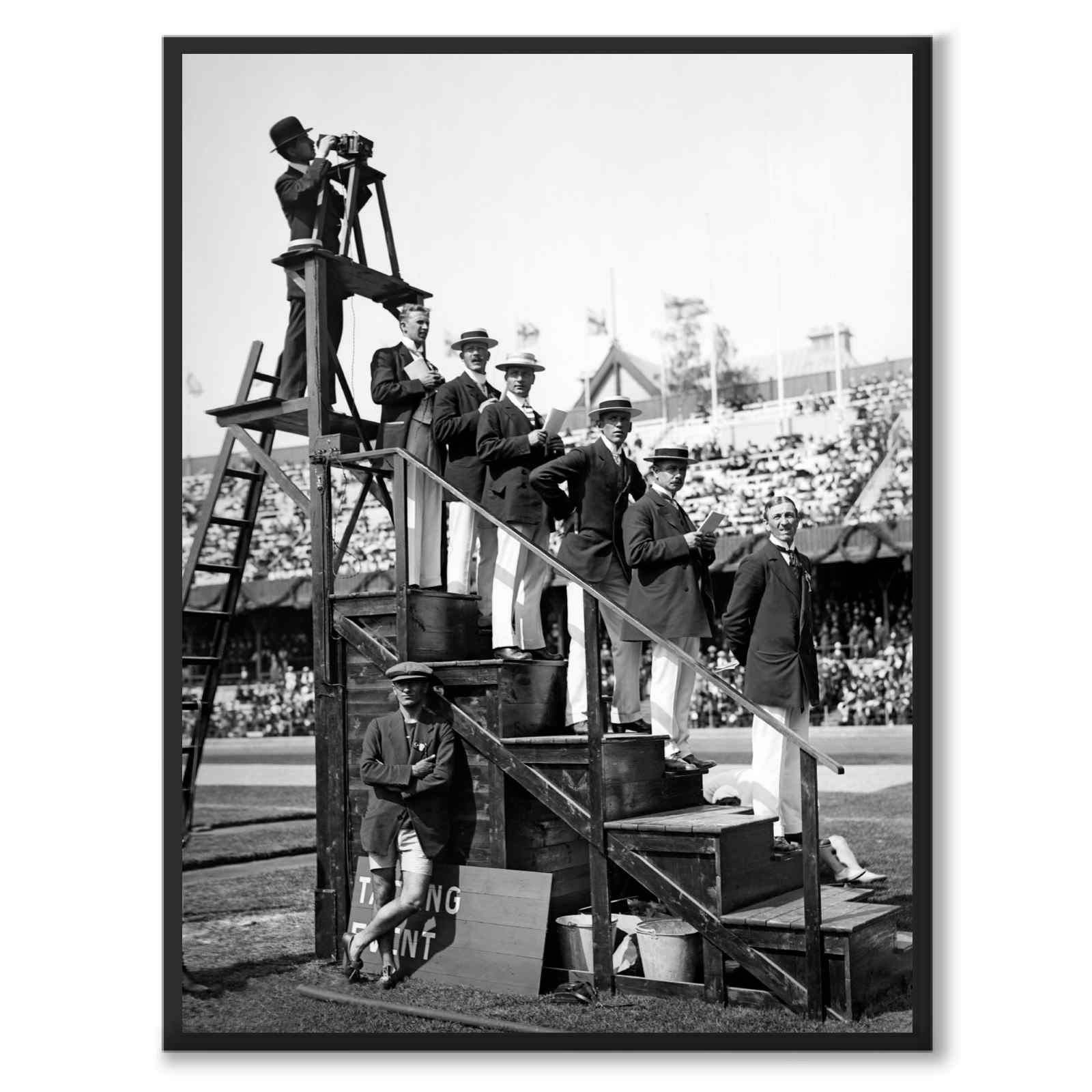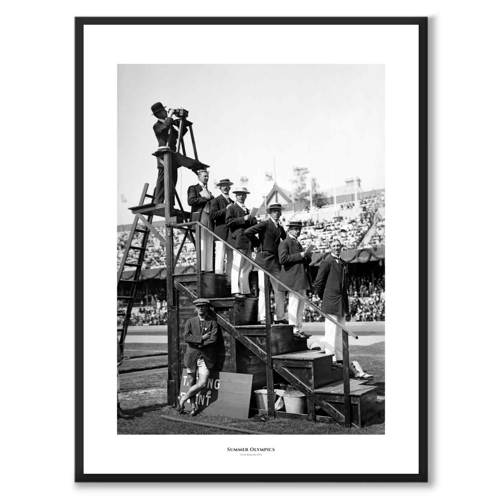Plakat med et gammelt bilde fra de olympiske sommerleker på Stockholm Stadion i 1912. På bildet ser vi tidtakeren og fotografen. Stockholms Stadion ble bygget kun for konkurransen og var helt ny. 2600 utøvere deltok, hvorav 60 kvinner, noe som tilsvarte 2,23 %. Selv om det kan virke lite, var andelen stor basert på hva som var vanlig på begynnelsen av 1900-tallet. En av lekenes mest bemerkelsesverdige konkurrenter var Shiso Kanaguri, den japanske maratonløperen som på mystisk vis forsvant midt i løpet, bare for å returnere til Sverige og fullføre distansen rundt 55 år senere. En TV-serie vil snart bli lansert for å gjenskape denne mystiske hendelsen.