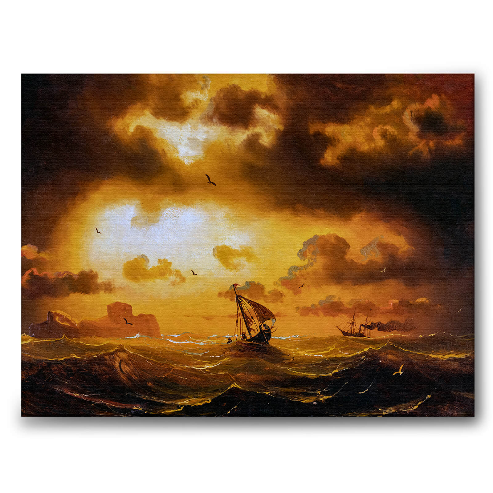 Lerret med det vakre maleriet Solnedgang til sjøs, eller Solnedgang på havet på svensk. Maleriet ble til i midten av Marcus Larson, en svensk maler.