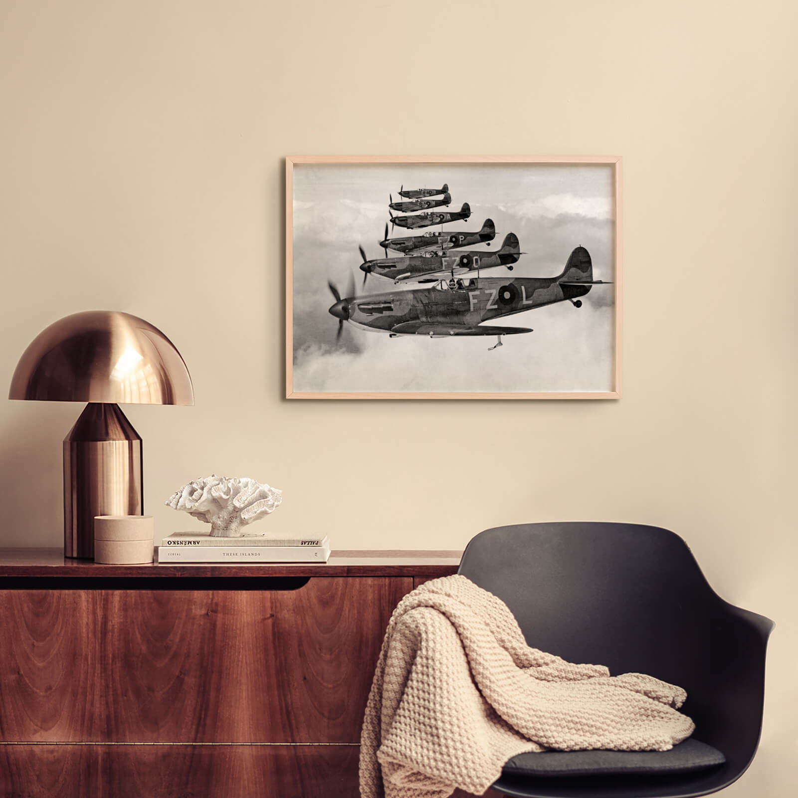 Plakat med et flyfoto av seks Supermarine Spitfires som flyr i formasjon under en øvelse fra andre verdenskrig i 1939.