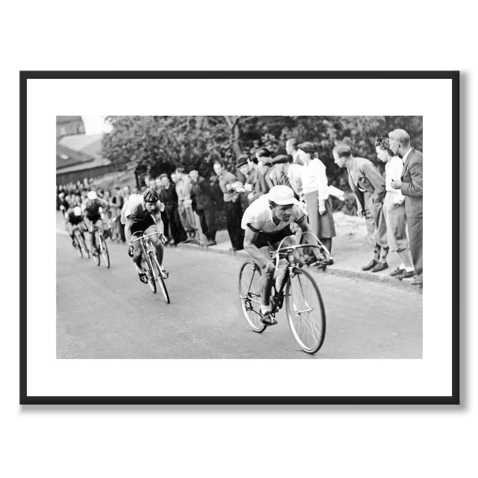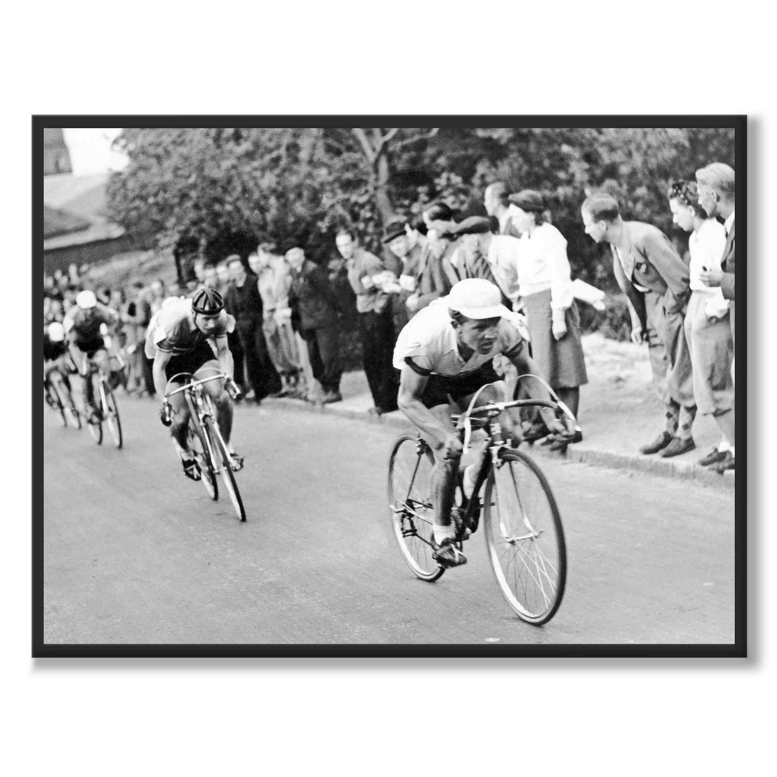 Plakat med et vintage fotografi av Sven "Svängis" Johansson under en konkurranse på 1940-tallet. Sven var en legendarisk konkurransesyklist og olympier.