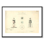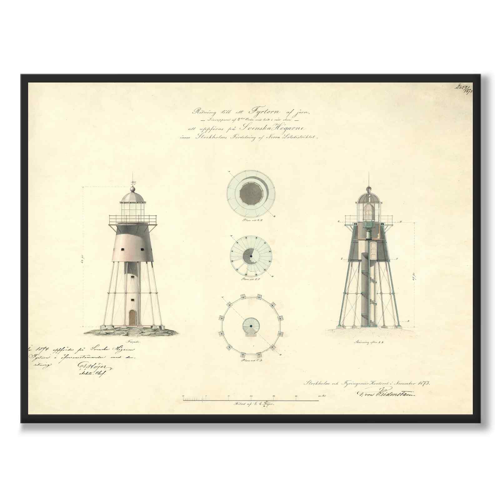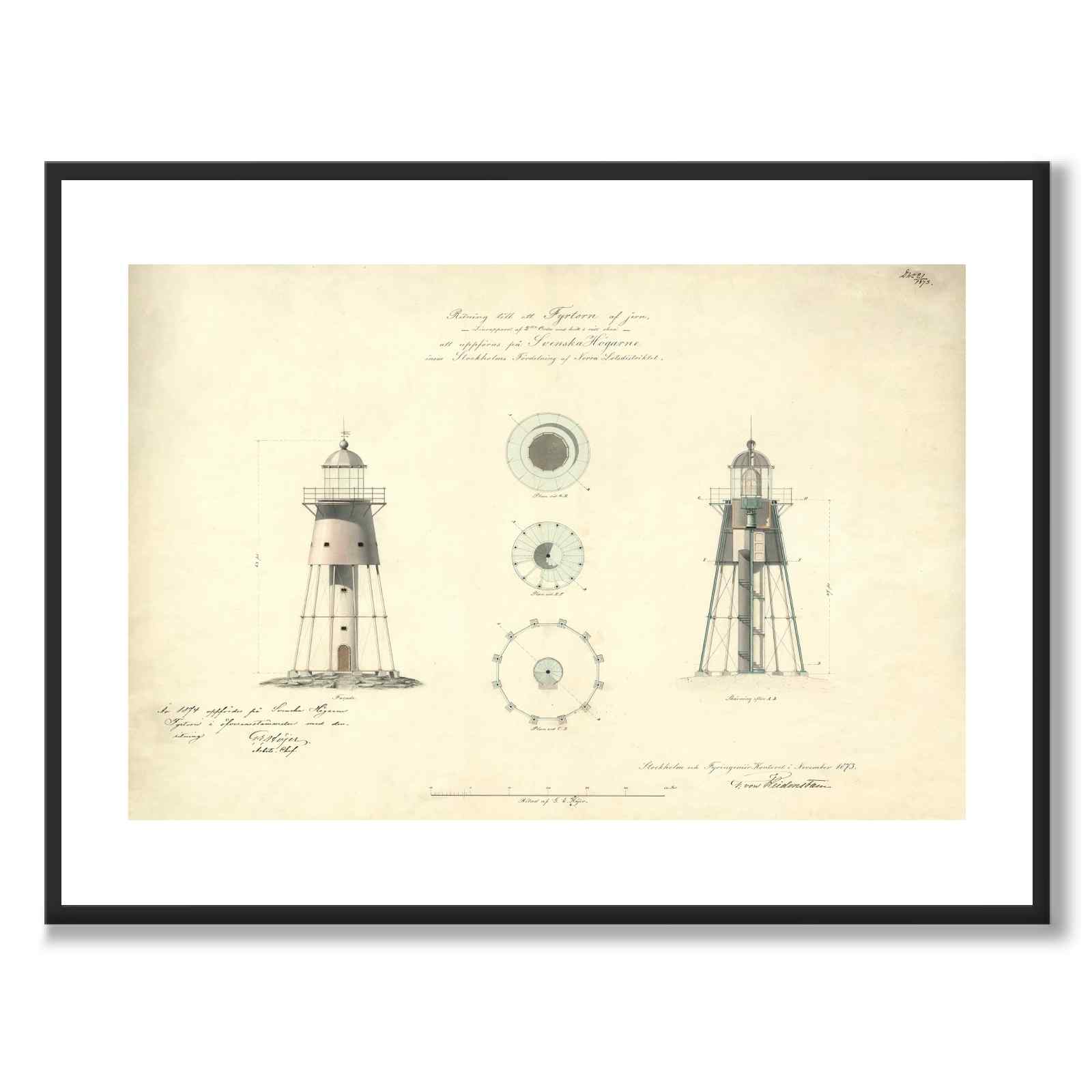 På bildet ser vi tekstene: "Svenska Högarna fyr. Tegning til et jernfyrtårn. Linseapparat av 2. orden med hvitt og rødt lys. Skal oppføres på Svenska Högarna innenfor Stockholms avdeling av det nordlige Lot-distriktet."
