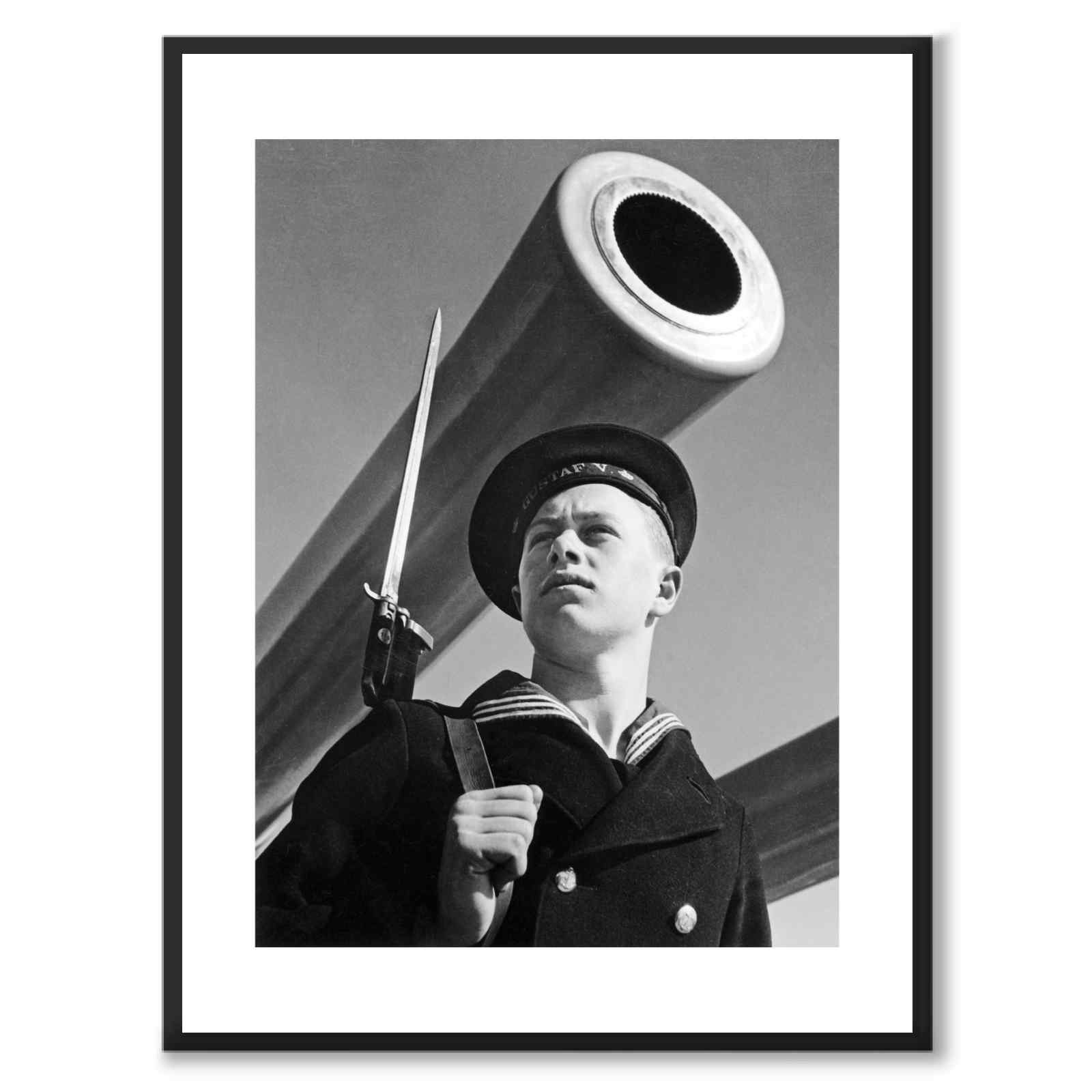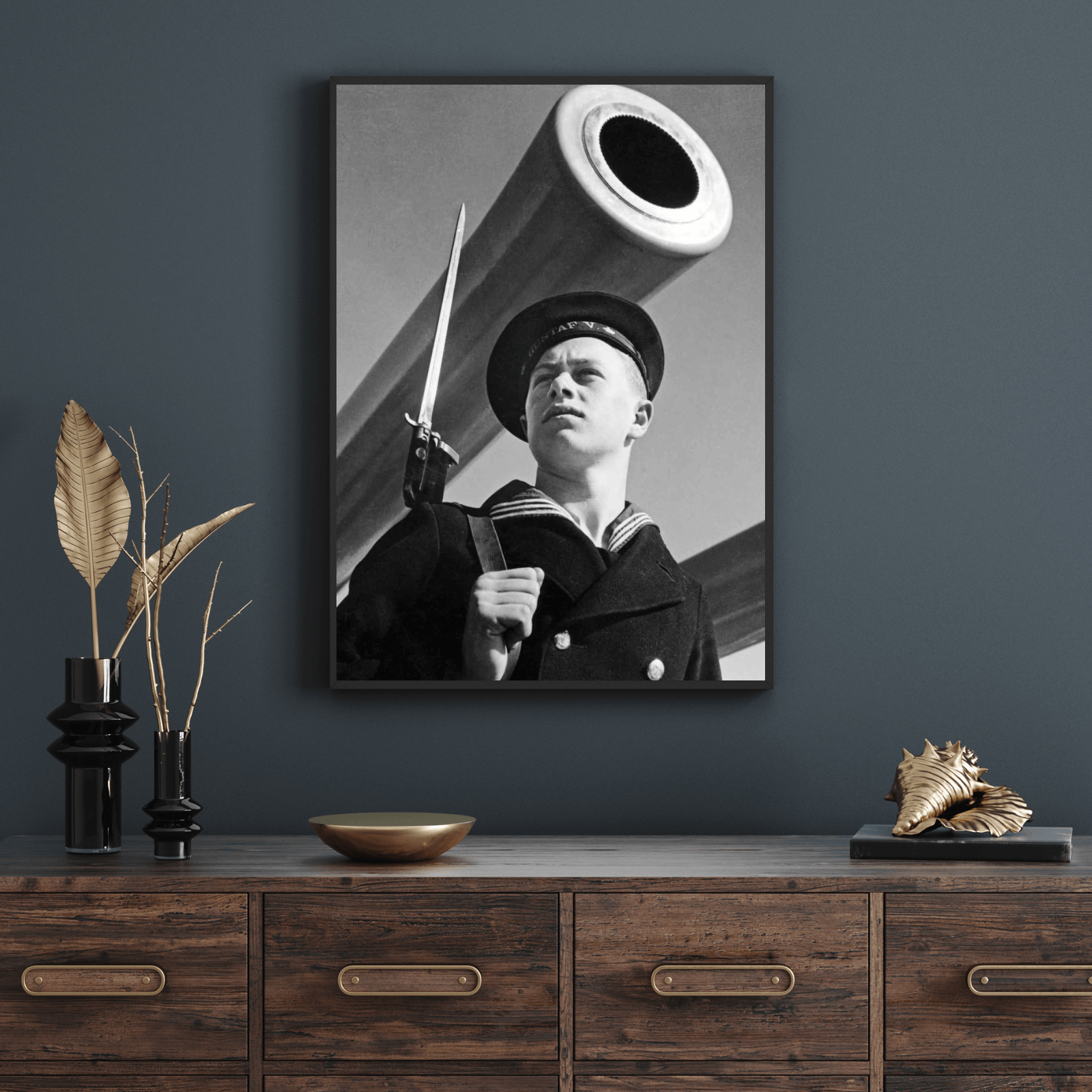 Plakat med motivet svenske marinen fra 1940-tallet. Bildet er tatt av en ung mann som ser ut, kledd i uniformen.