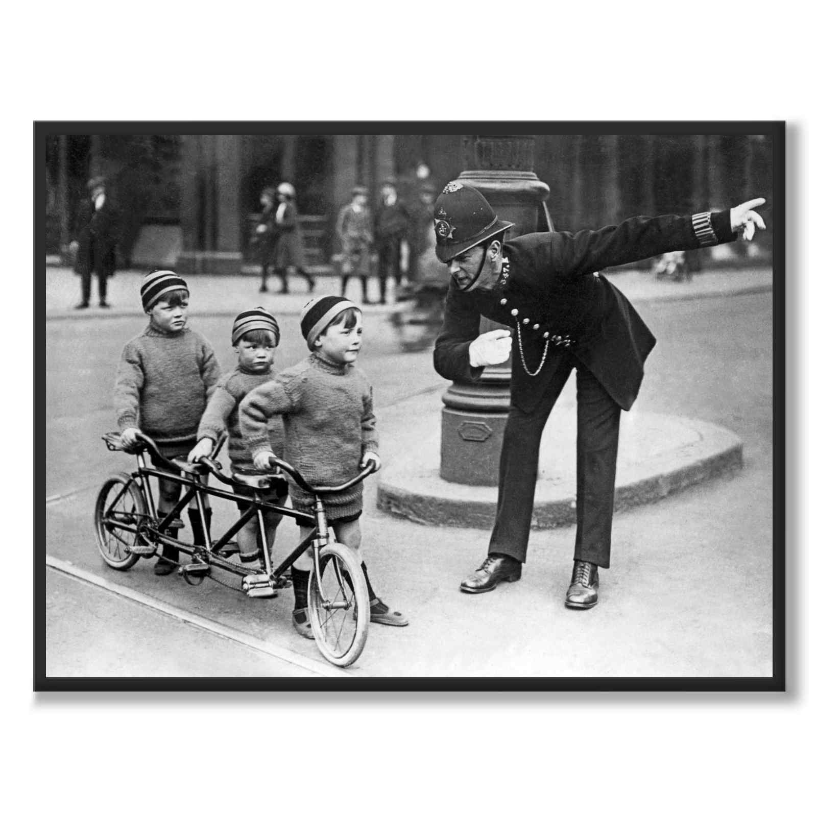 Plakat med et unikt bilde av London på 1930-tallet. En politimann viser vei til gutter som har en spesialbygd liten sykkel som passer til tre syklister.