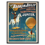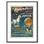 Plakaten annonserer «The Balloon Horse Jupiter», en av sirkusets store attraksjoner, der en rytter og en hest utfører en fantastisk himmelfartshandling med en luftballong.