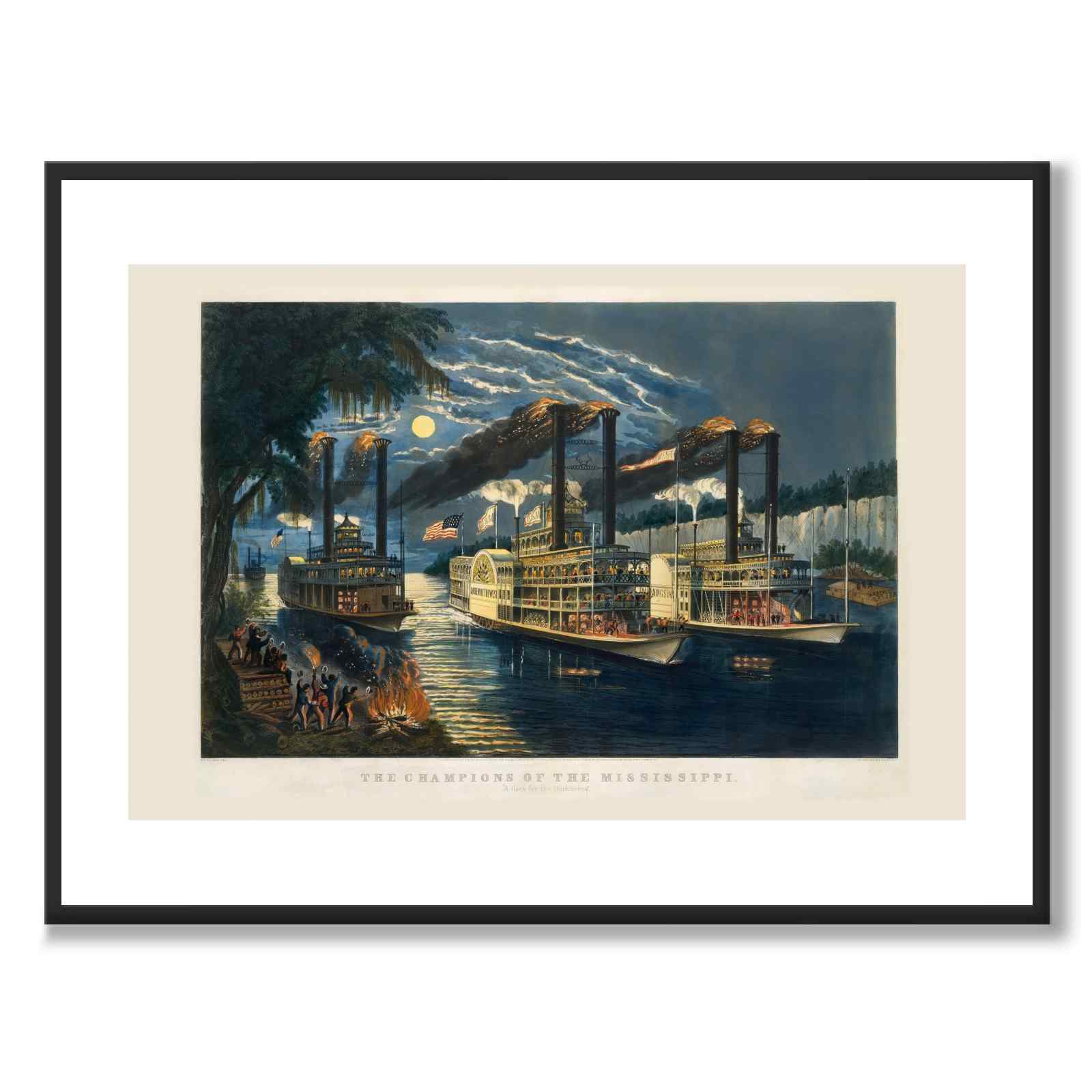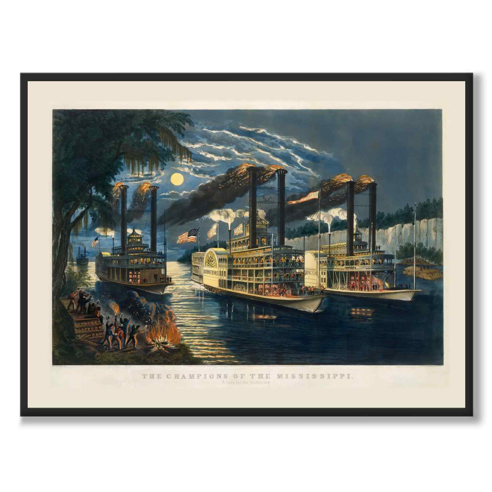 I dette trykket fra 1866 ser vi en dramatisk månebelyst Mississippi-elvescene, der fire dampbåter reiser med flammer og røyk fra skorsteinene. Til høyre i bildet leder «Vestens dronning» og «Morningstar» løpet, mens to dampere seiler bak. På stranden til venstre er det bål og en liten mengde menn som heier og vinker til båtpassasjerene.