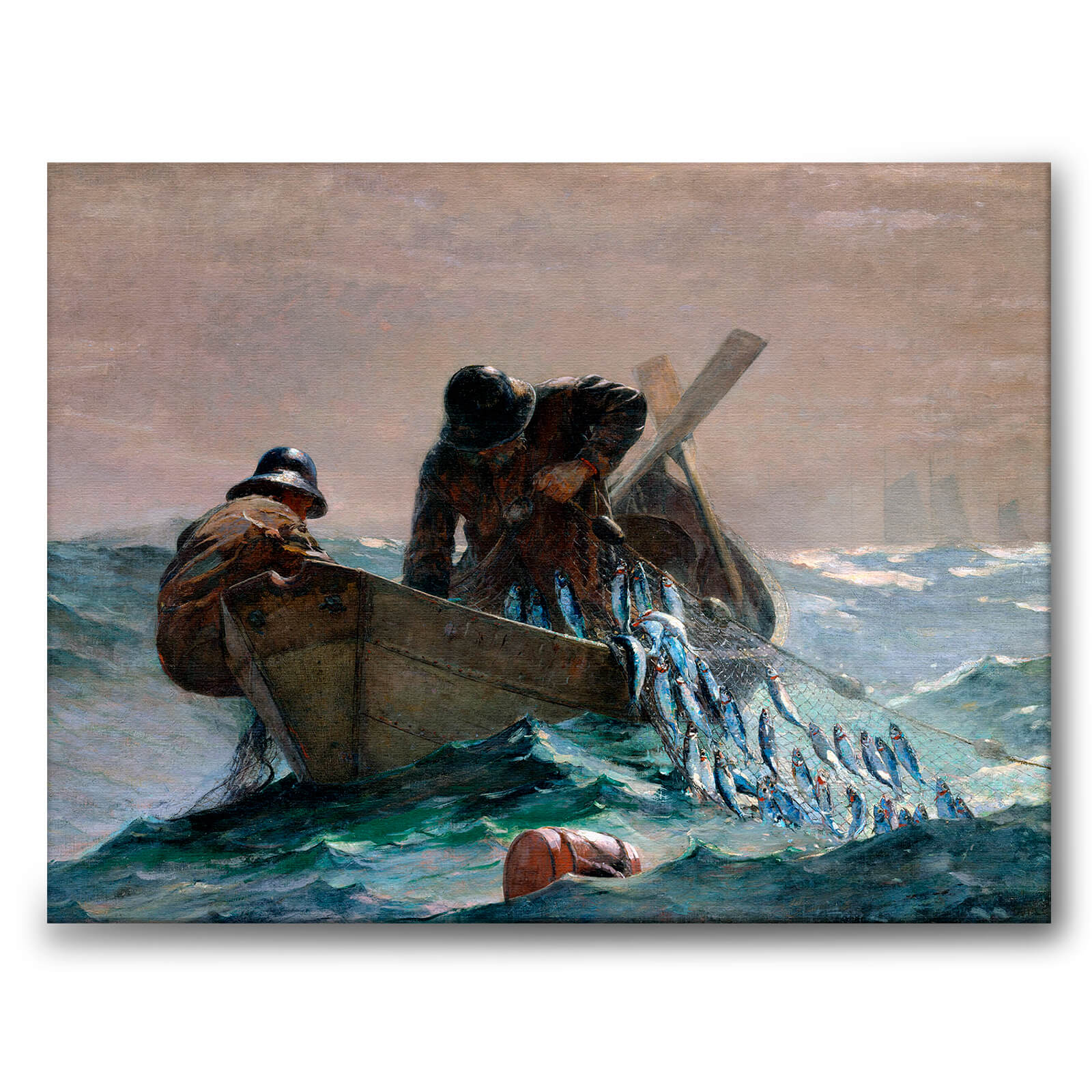 Homers maleri av de to fiskerne i den lille robåten viser samarbeidet som kreves for å lykkes med å heve de tunge garnene og hente inn fangsten tilbake til de større skipene sett i bakgrunnen.