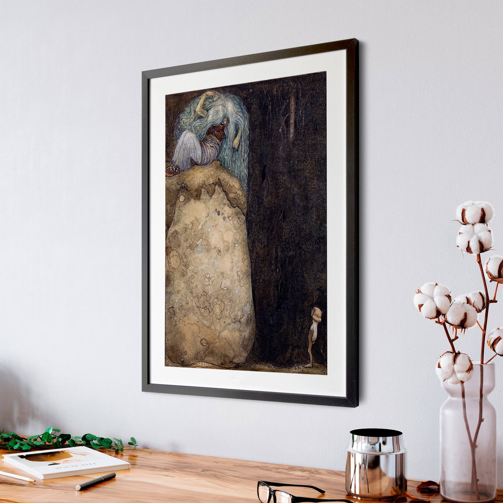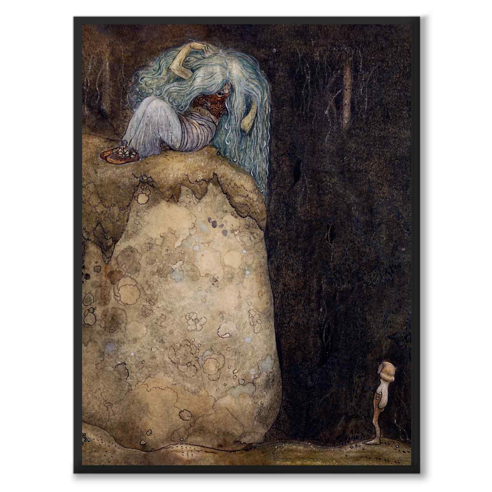 Plakat med maleriet Hva vil du ha her i skogen min? hun gråt, da julenissen kom gående av John Bauer fra 1912.