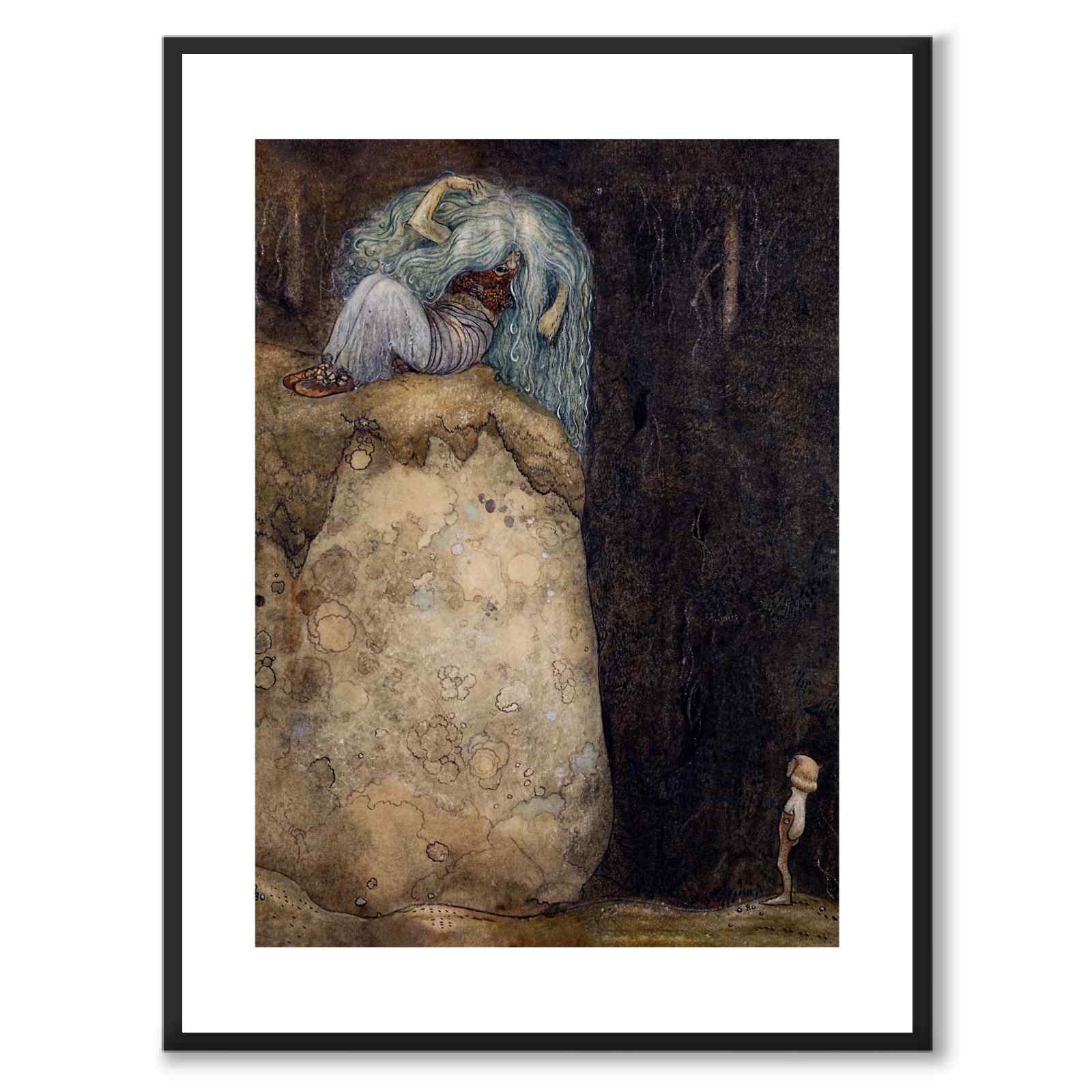 En huldra sitter på en stor stein. Når Nisse kommer gående, ser hun ned på den lille gutten med det grønne håret og utbryter " Hva vil du her i skogen min?" . Illustrasjonen ble publisert med historien Gutten som aldri var redd av Alfred Smedberg i historiesamlingen Blant alver og troll i 1912.