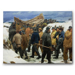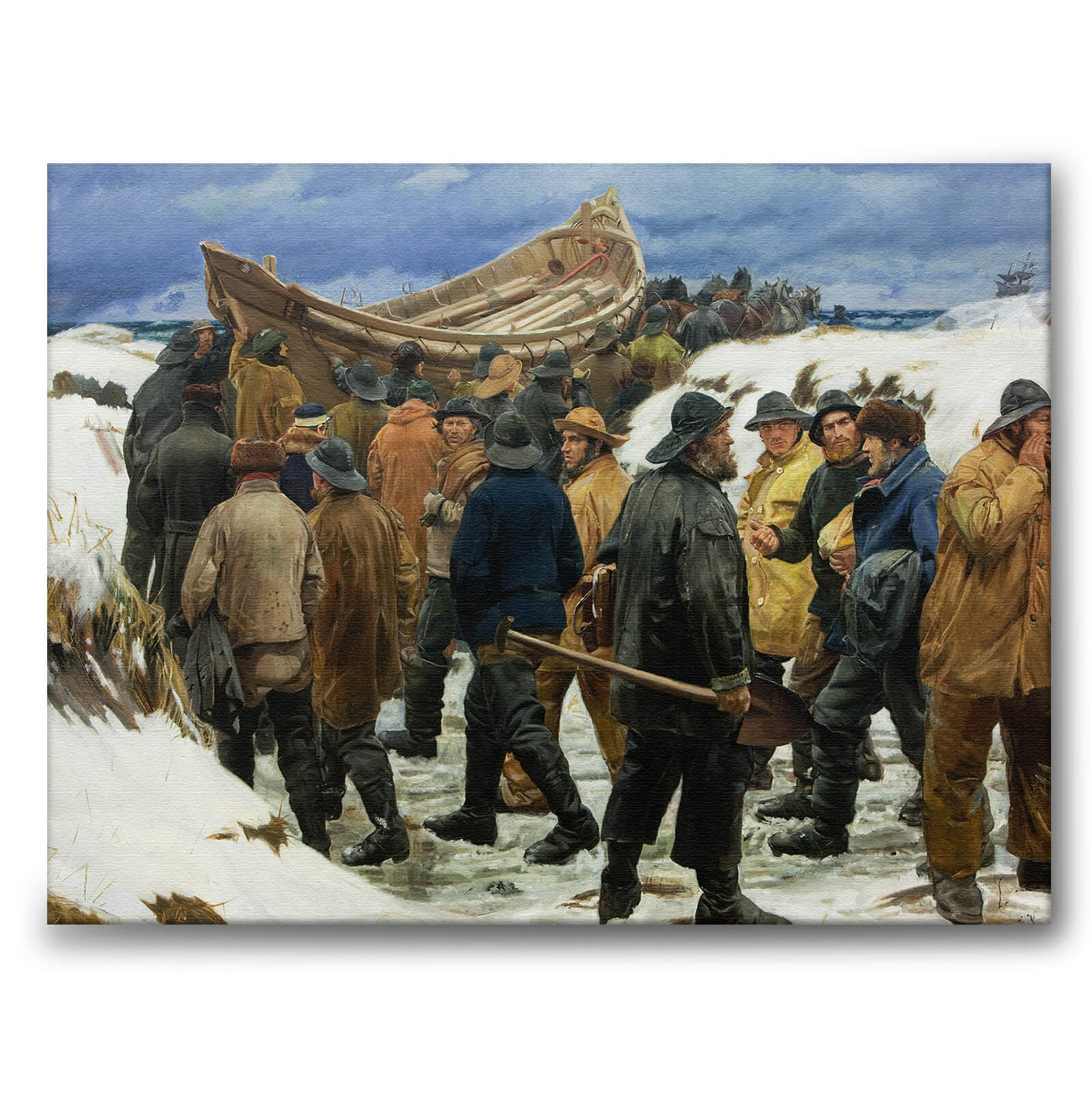 Med dette fantastiske maleriet av sjømenn i et snødekt kystlandskap fortsatte Michael Ancher sin historie om Skagens heroiske fiskere – et epos i stor skala. Historien åpnet med spørsmålet Will He Weather the Point og gikk videre til en foreløpig slutt med A Crew is Rescued og avsluttet til slutt i The Drowned Fisherman .