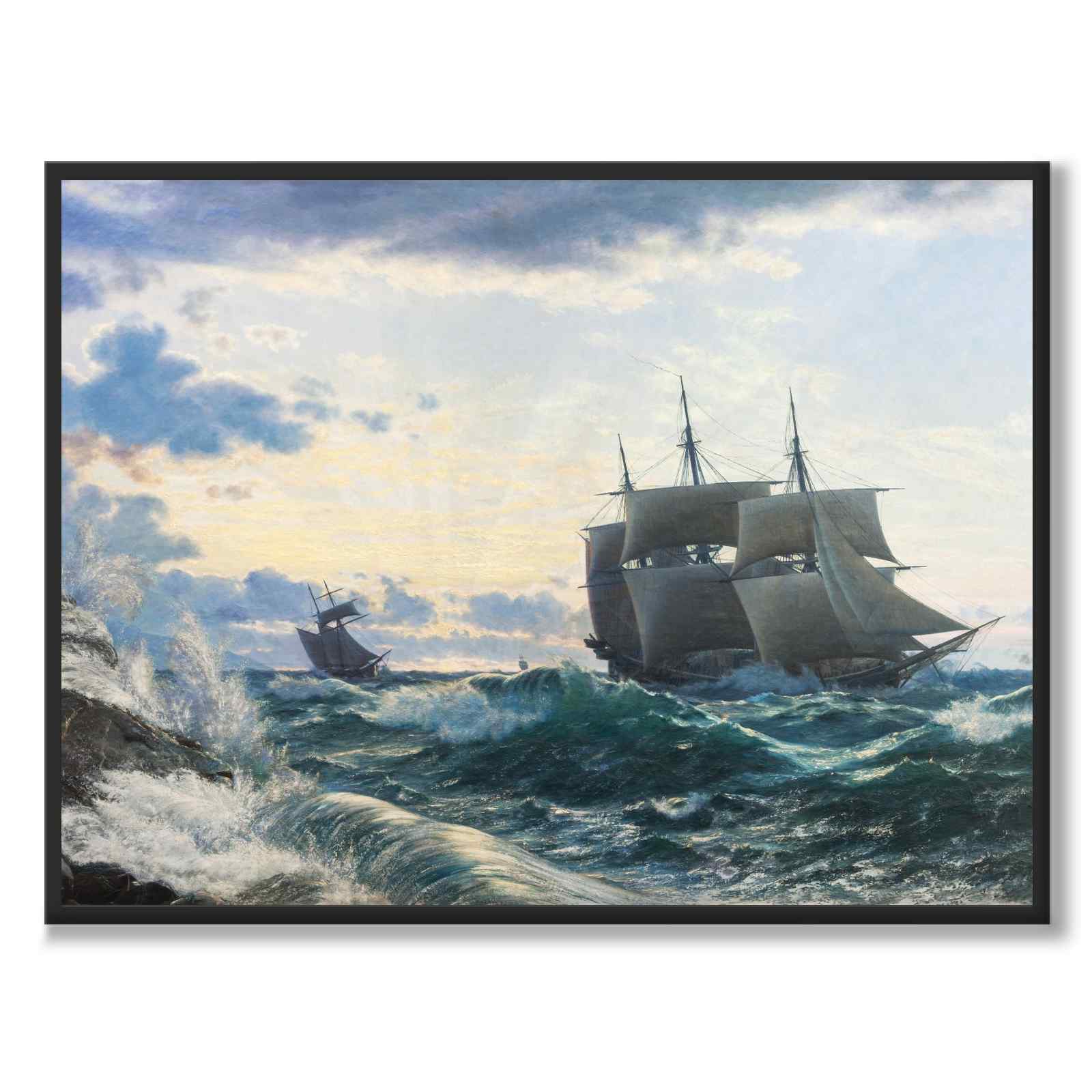 Plakat med et vakkert maleri malt i 1878 av den danske kunstneren Carl Rasmussen. Maleriet heter The morning after a storm og viser himmelen som bryter opp over et fortsatt stormfullt hav. På havet seiler også to skip over de blå bølgene.