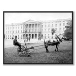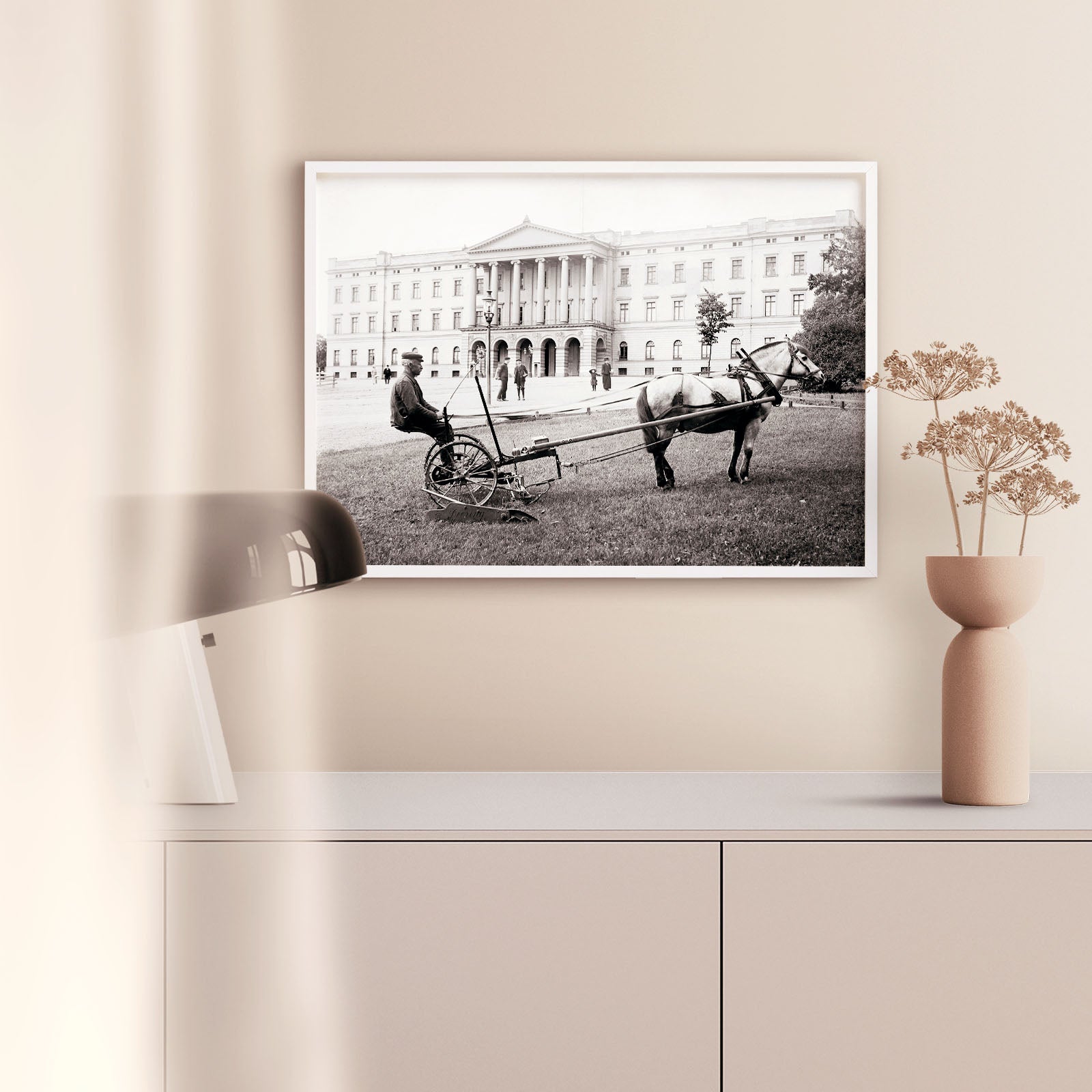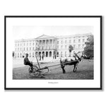 Plakat med fotografi av en hestetrukket slåmaskin i Slottsparken ved Slottet i Oslo i 1912.