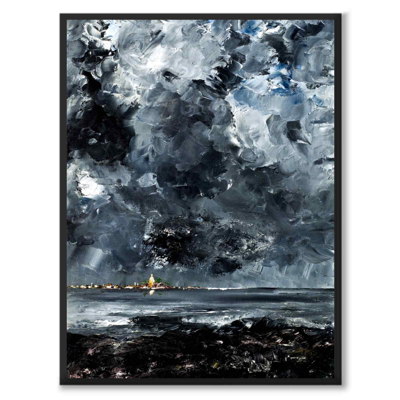 På bildet ser vi et mørkt landskap med en himmel fylt med store skyformasjoner i hvitt, svart og grått. Nedre del av bildet består av en vannflate og i forgrunnen en mørk strandkant. I horisonten ser vi en by. Byen ser ut til å flyte på vannet, som en luftspeiling. Byen – som symboliserer sivilisasjon, kultur og liv – er svært avsidesliggende. Som tilskuere befinner vi oss i et mørkt landskap langt fra det siviliserte samfunnet.