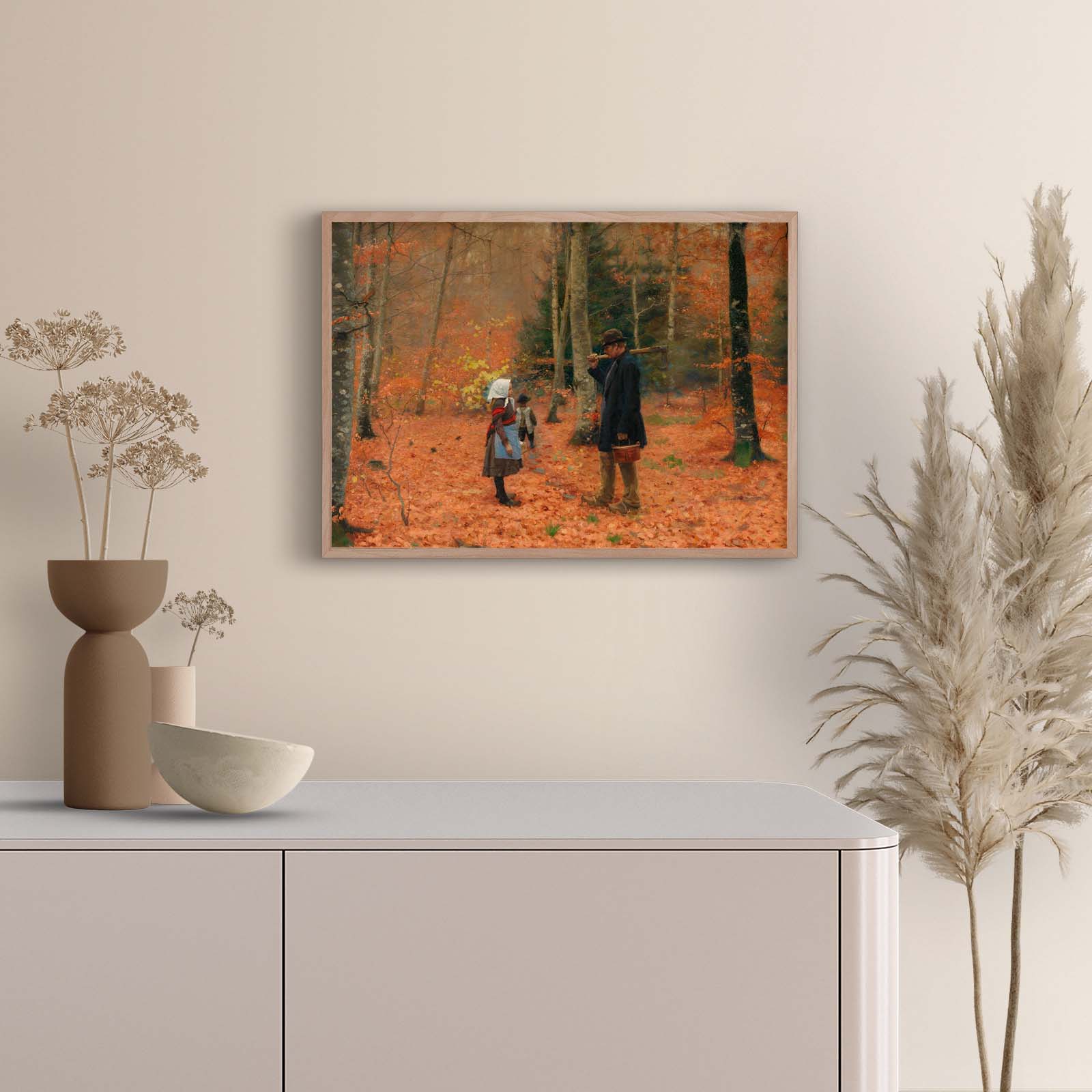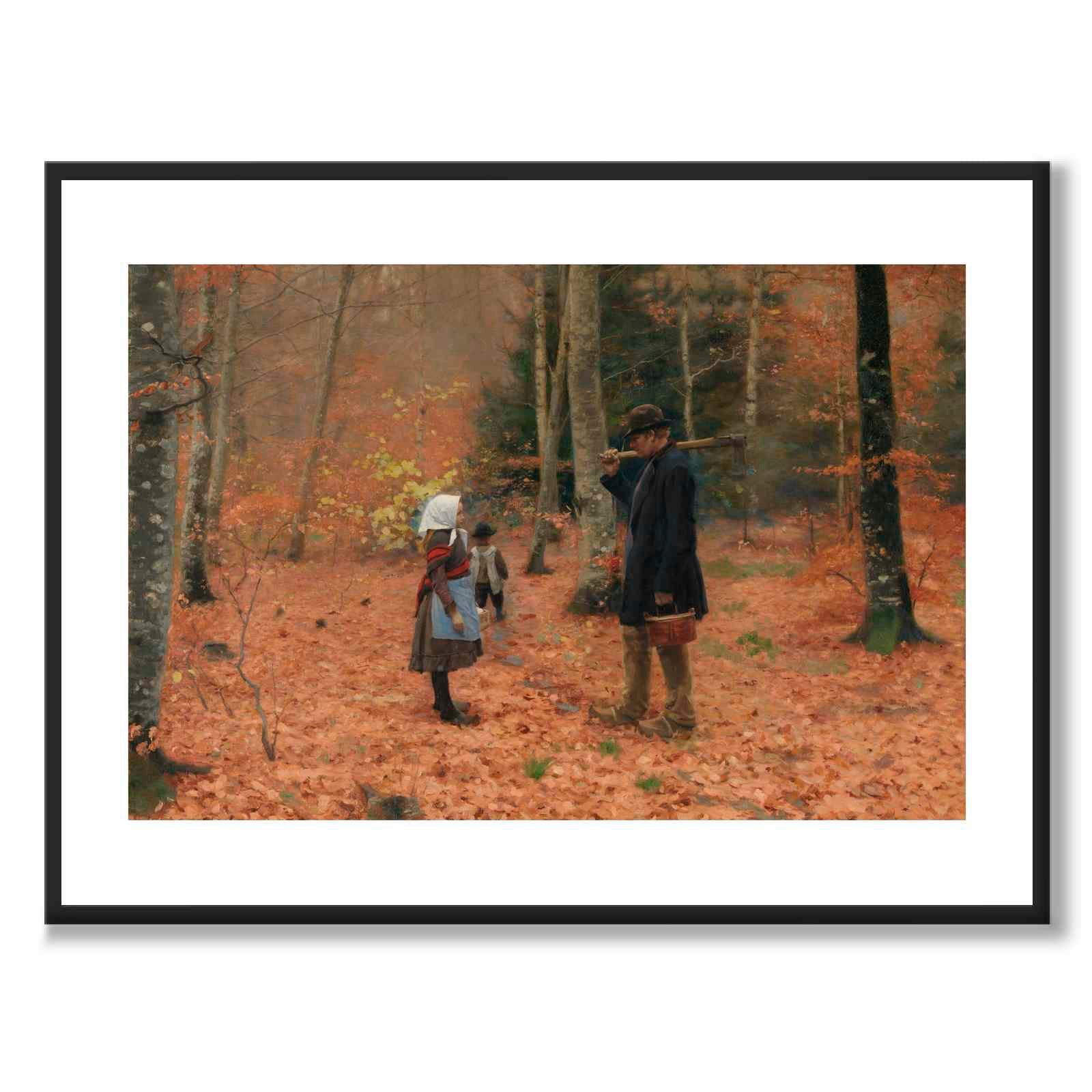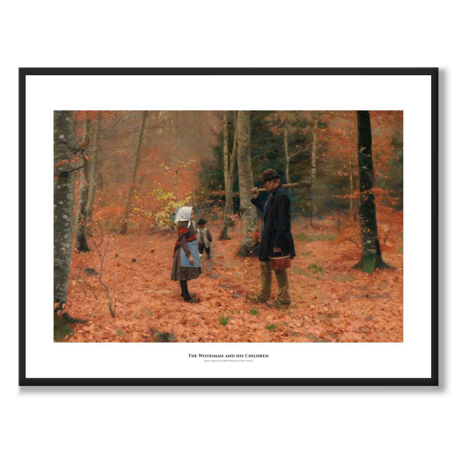 Plakat med det vakre maleriet Skogsarbeider og hans barn av Hans Andersen Brendekilde (1857-1942). Maleriet viser en skogsarbeider som snakker med datteren i et fantastisk høstlandskap med dype oransje toner kombinert med grå trestammer og vakre grønne graner.