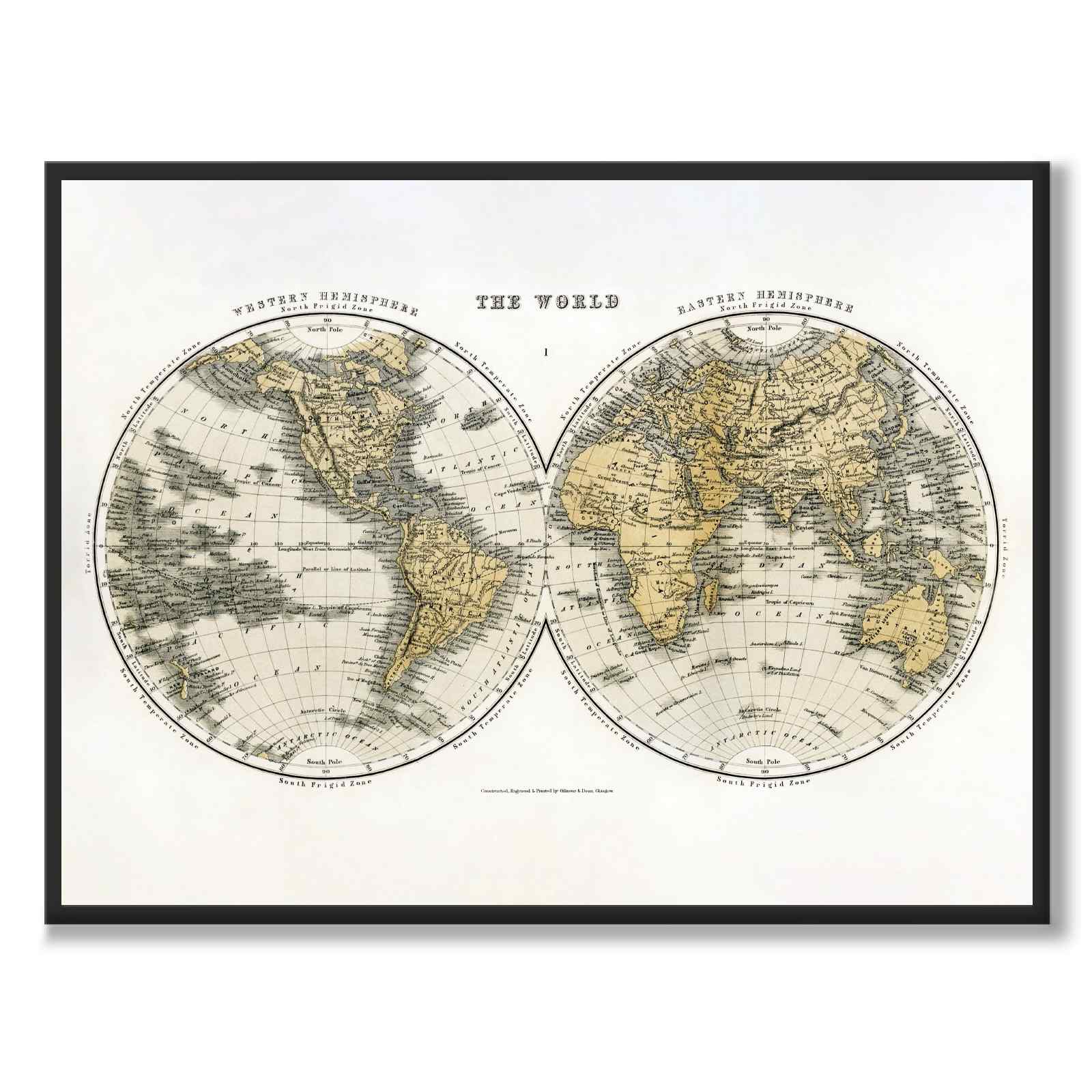 Plakat med verdenskart fra 1859. Kartet er illustrert av den irske matematikeren og geologen James Bryce.