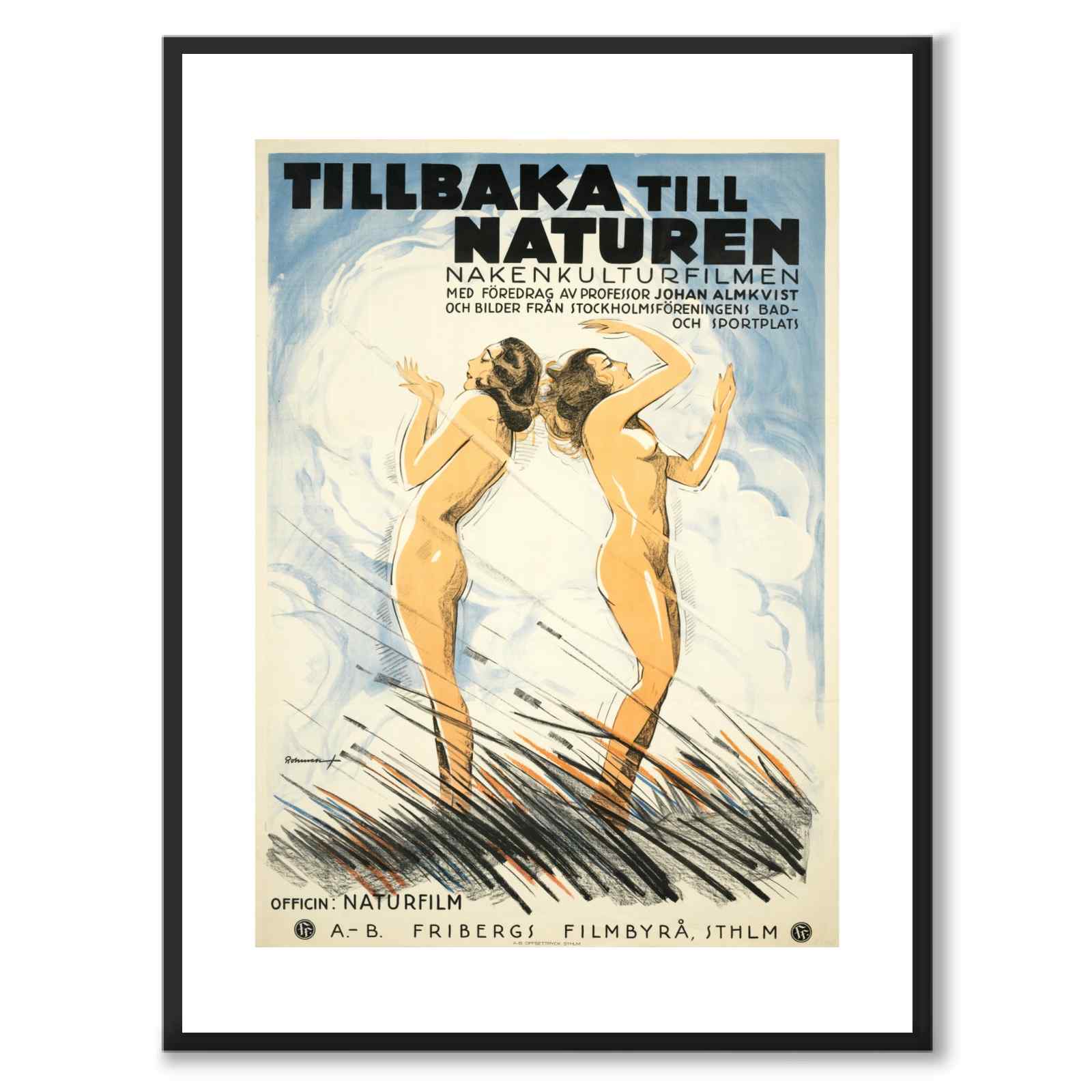 Plakat av Back to Nature, en nakenkulturfilm fra 1930-tallet. På plakaten står det Nakenkulturfilmen: med foredrag av professor Johan Almkvist og bilder fra Stockholmsföreningens Bad-och Sportsplats.