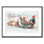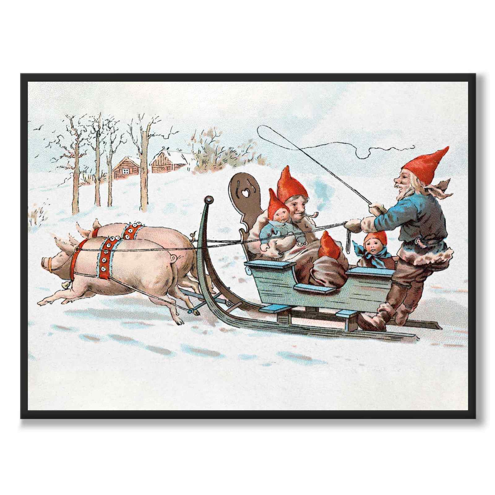 Plakat med klassisk julemotiv av Jenny Nyström fra 1890-tallet. En familie av alver kjører på en griseslede gjennom et vinterlandskap.