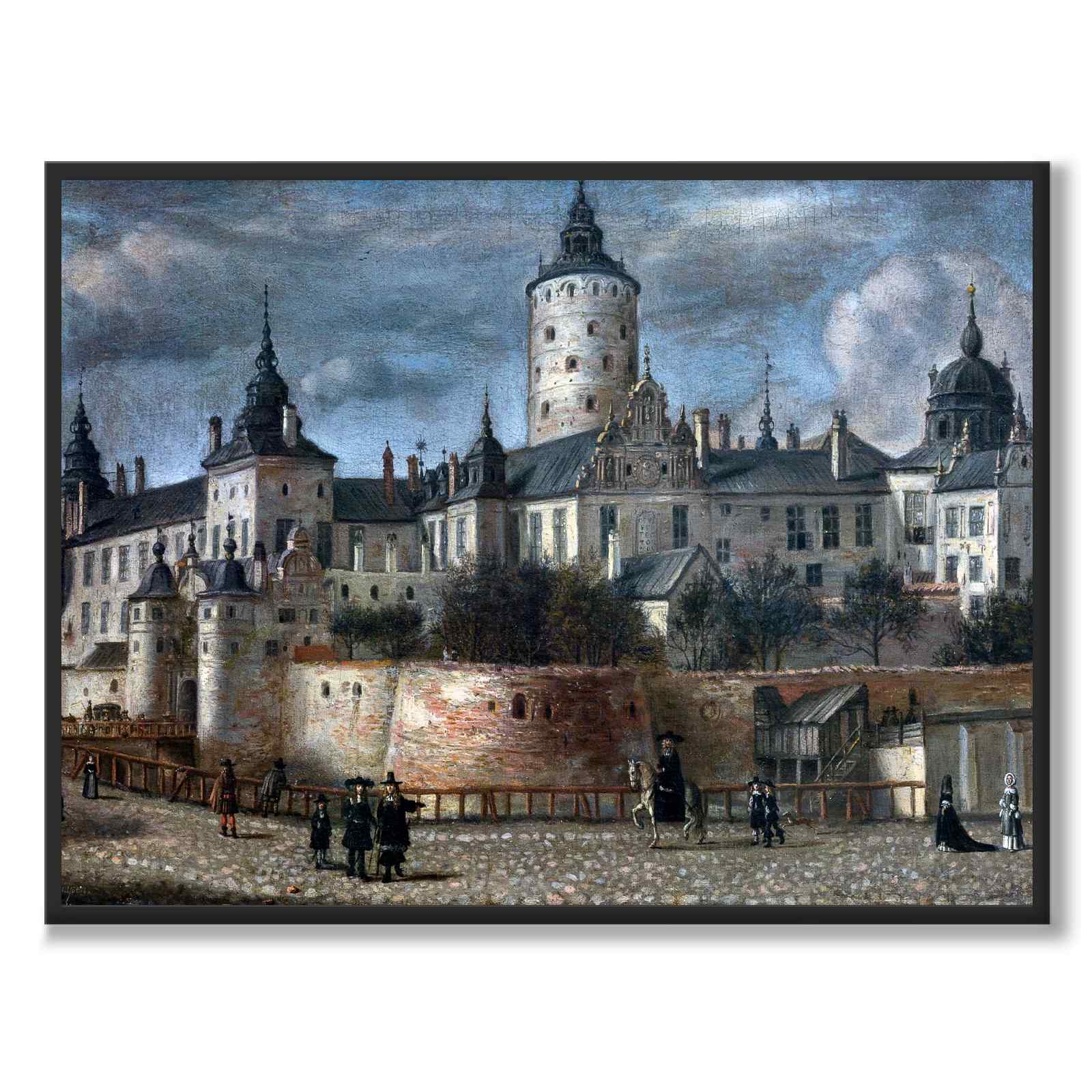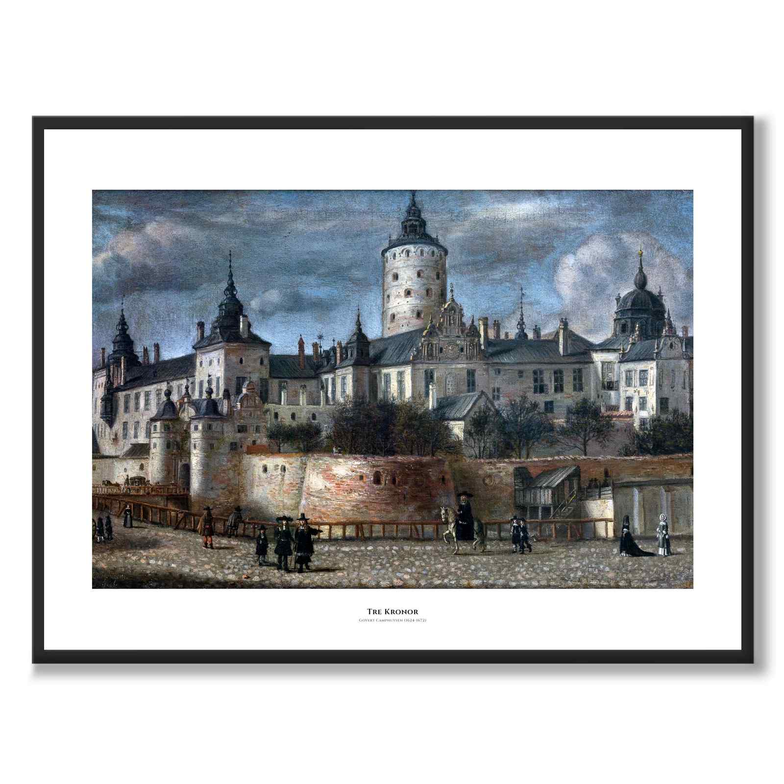 Tre Kronor slott i 1661 malt av den nederlandske kunstneren Govert Camphuysen. I forgrunnen ser vi Slottsbacken og den såkalte Løveballen. Maleriet er den beste skildringen vi har av slottet på midten av 1600-tallet og er malt fra sørvest.