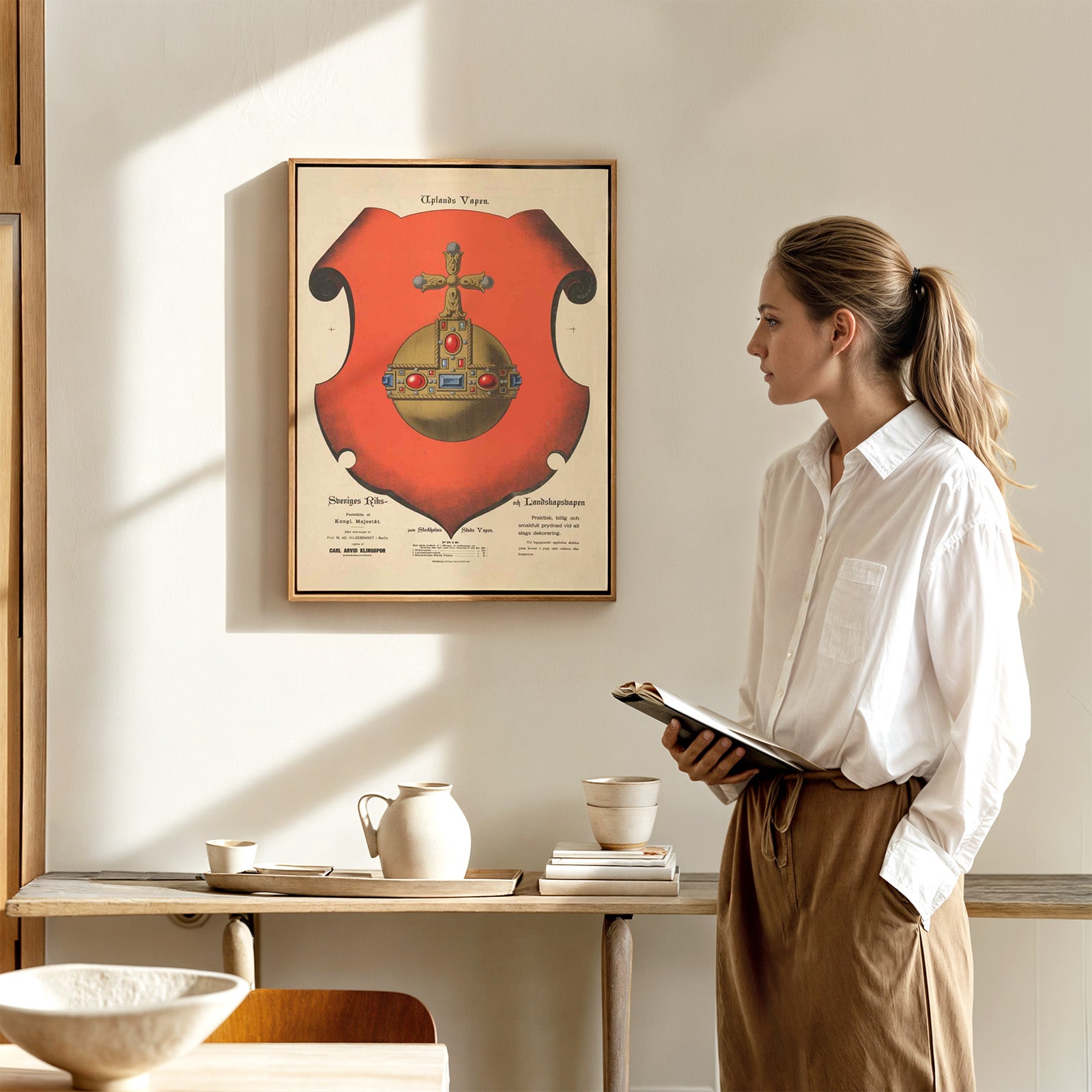 Teksten over våpenskjoldet lyder: "Uplands armer". Nederst til venstre står det: "Sveriges riks- og landsvåpen. Etablert av den kongelige majestet. Etter tegninger av prof. M. AD. Hildebrandt i Berlin. Utgitt av Carl Arvid Klingspor."
