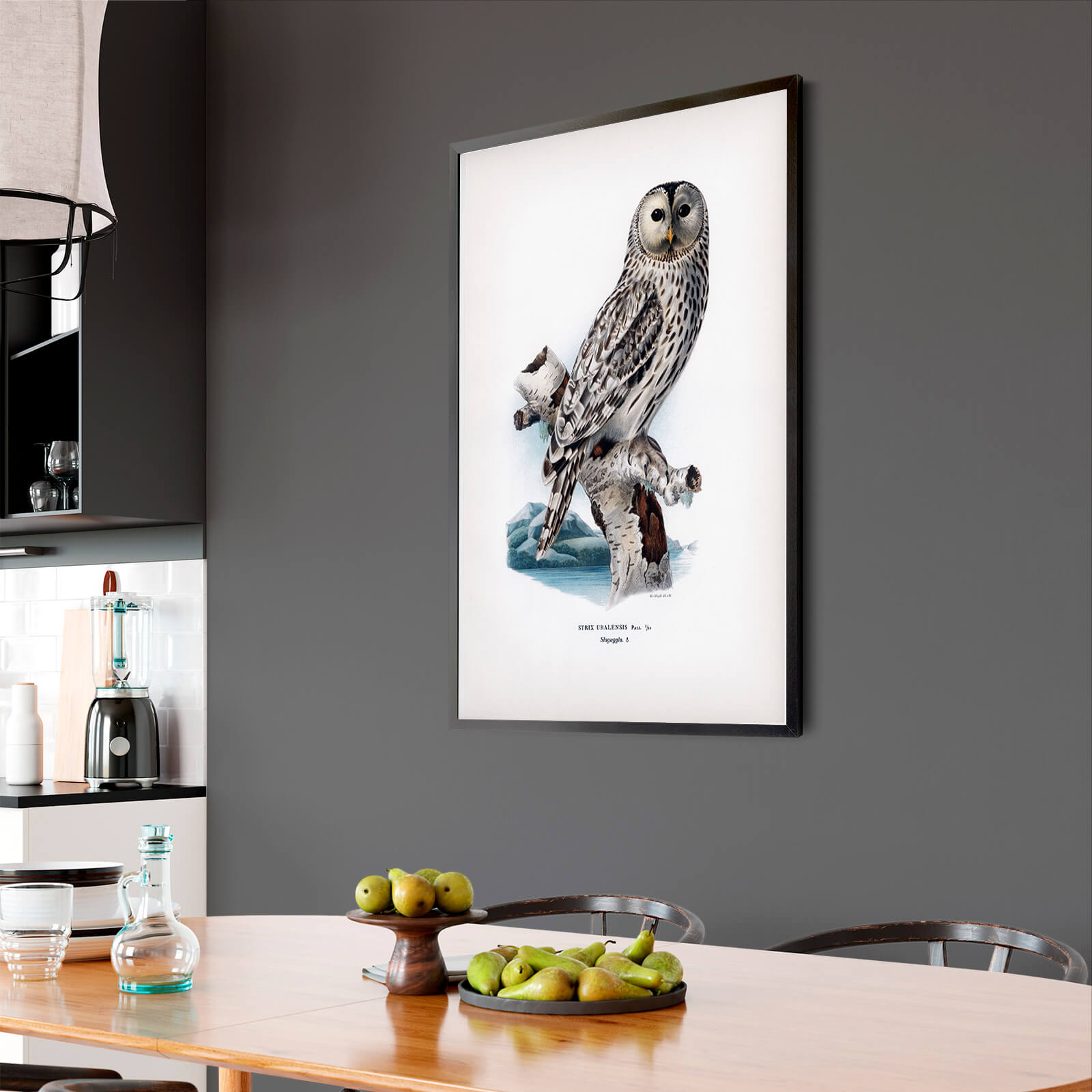 Plakat med en vintage plakat av en sperret ugle . Illustrasjonen er tegnet av brødrene von Wright og publisert på begynnelsen av 1900-tallet i boken Swedish Birds After Nature Och På Sten Ritad. På bildet ser vi blant annet teksten Strix Uralensis - latin for slagugle .