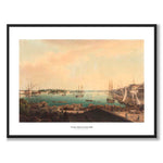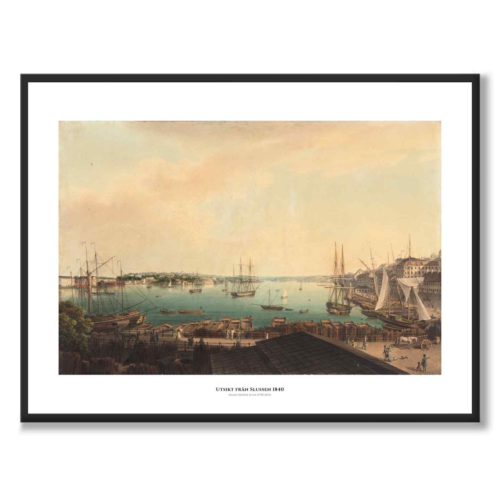Plakat med maleriet "Utsikt fra Slussen" fra år 1840 malt av Johan Fredrik Juhlin, en svensk kunstner kjent for sine litografier og landskapsmalerier.