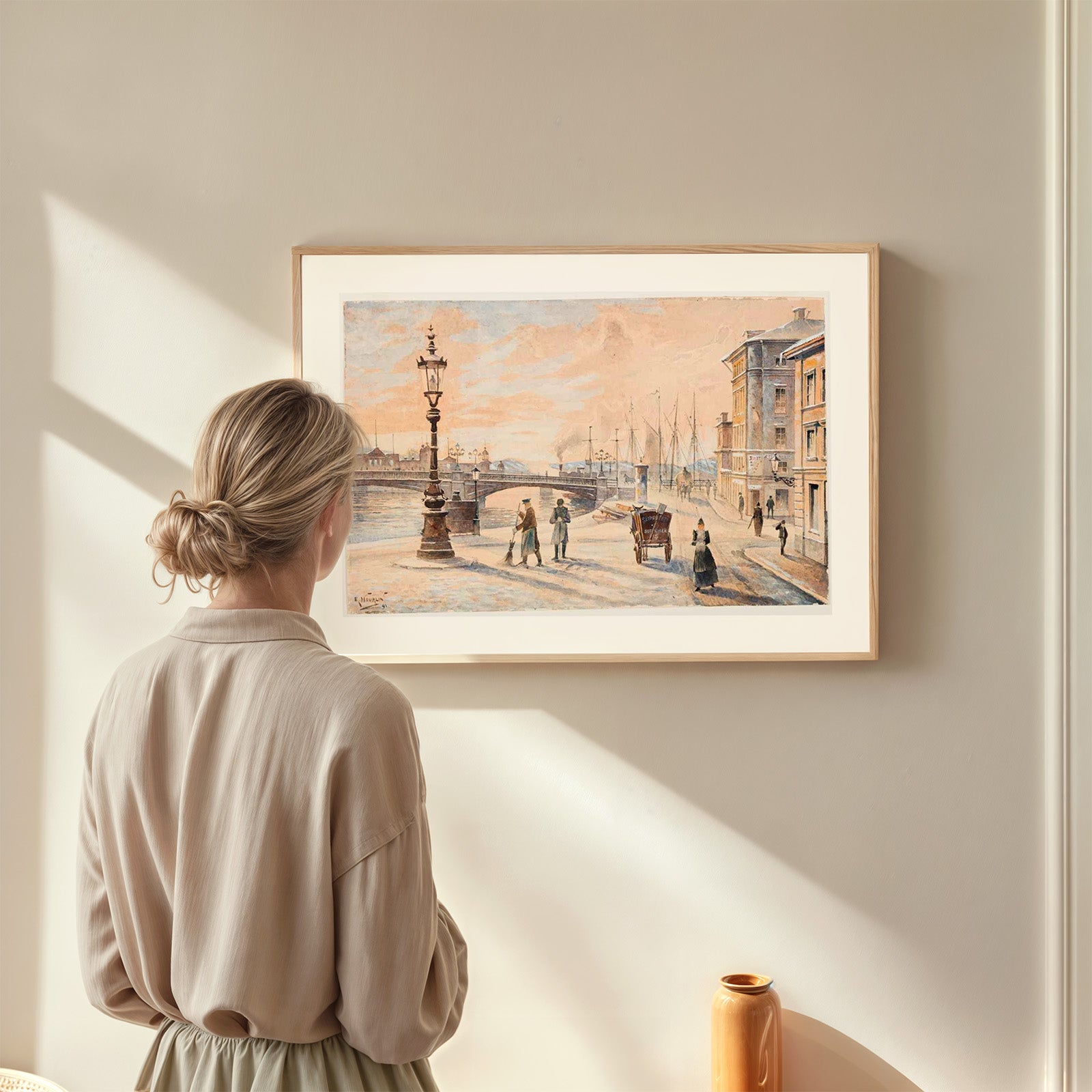 Maleriet viser et bybilde av Stockholm, nærmere bestemt ved Vasabroen med Strömbadet i bakgrunnen. Vi kan se noen mennesker i tidstypiske klær samt en hestevogn, som gir en fin skildring av bylivet på slutten av 1800-tallet.
