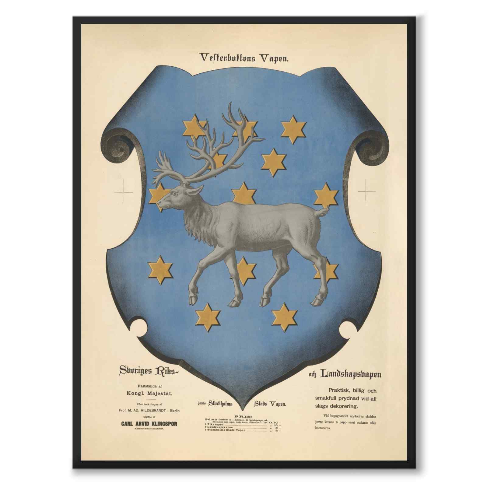Teksten over våpenskjoldet lyder: Våpenskjold fra Västerbotten. Nederst til venstre står det: "Sveriges riks- og landsvåpen. Etablert av den kongelige majestet. Etter tegninger av prof. M. AD. Hildebrandt i Berlin. Utgitt av Carl Arvid Klingspor."