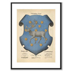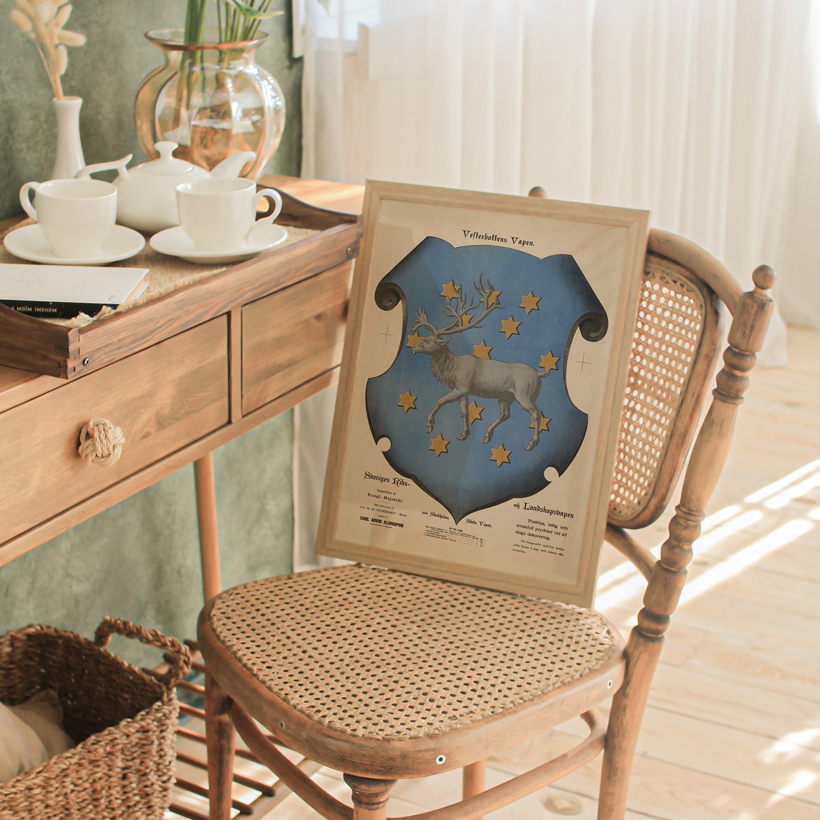 En vakker tegning med det heraldiske våpenskjoldet for provinsen Västerbotten fra 1800-tallet. Våpenet viser et reinsdyr og ble presentert ved Gustav Vasas begravelse i 1560. På 1590-tallet ble stjernene lagt til.