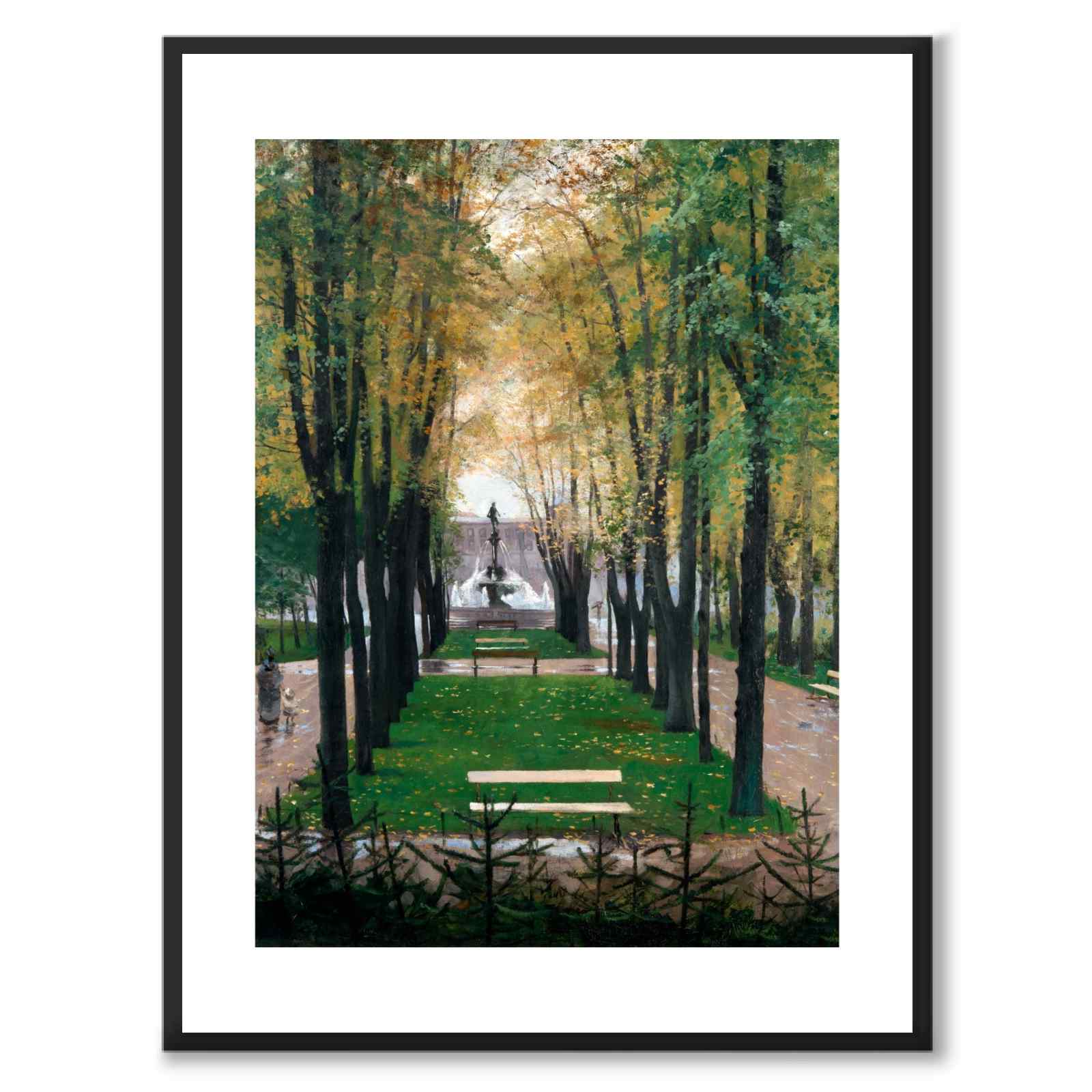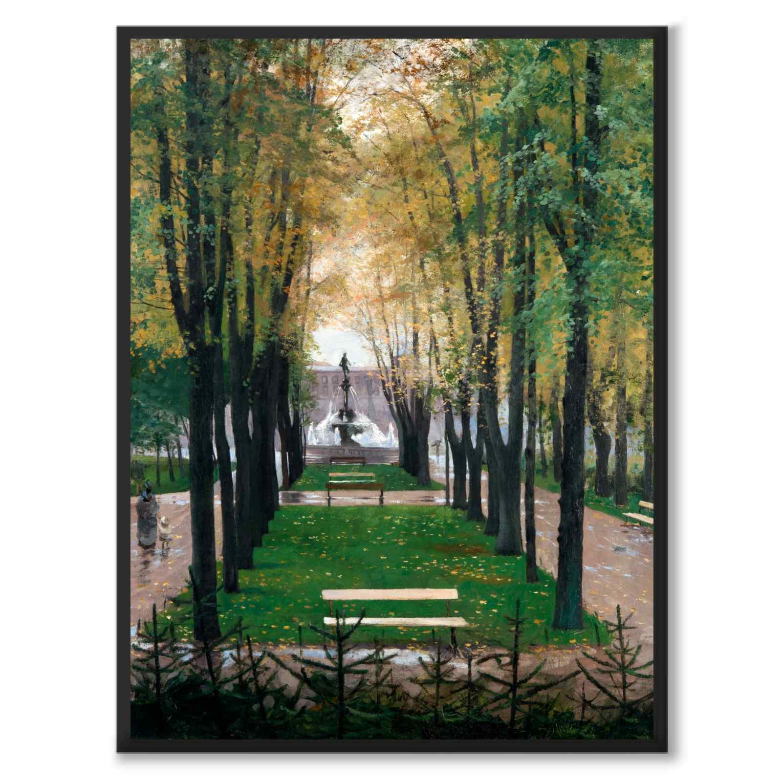 Plakat med maleriet Utsikt fra vinduene i Fürstenberg-galleriet. Maleriet ble laget mellom 1883 og 1885 av den svenske kunstneren Hugo Birger. Motivet er malt fra et perspektiv fra vinduet til Fürstenbergska galleriet med utsikt over Brunnsparken i Gøteborg.