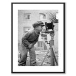 Plakat med fotografi av et gammeldags kamera fra Sverige på 1940-tallet. En klassisk bussgutt med caps står og ser inn i et storformatkamera som er satt opp på et stativ.