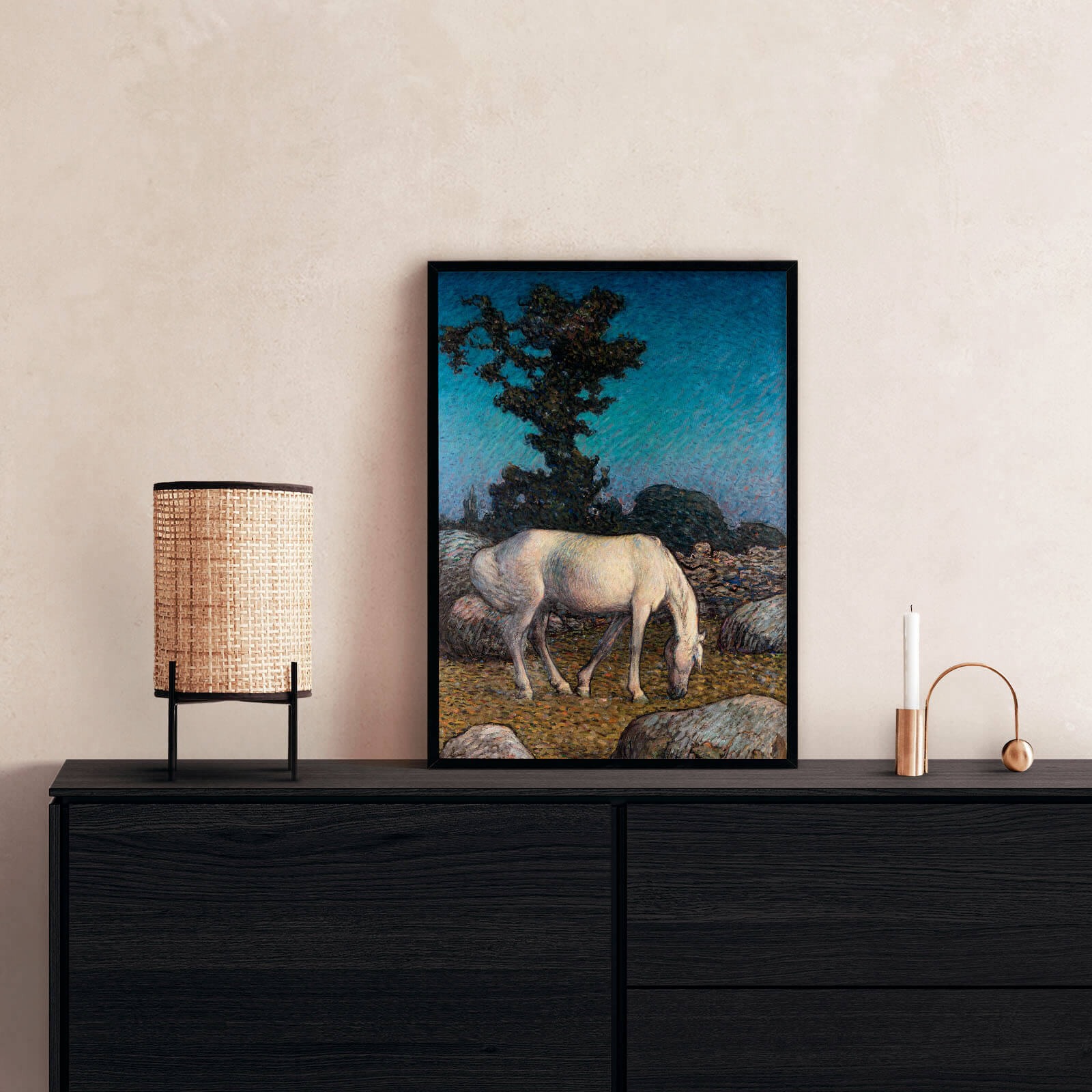 Plakat med maleriet White Horse at Dusk av Nils Kreuger (1858-1930). Nils Kreuger var en kjent svensk landskapsmaler med bakgrunn fra Royal Academy of Arts og fra en privat kunstskole i Paris. Jo lenger Kreuger var aktiv, jo mer ble motivene fokusert på skumring, regn eller tåke. Hans første utstilling var i Paris i 1882.