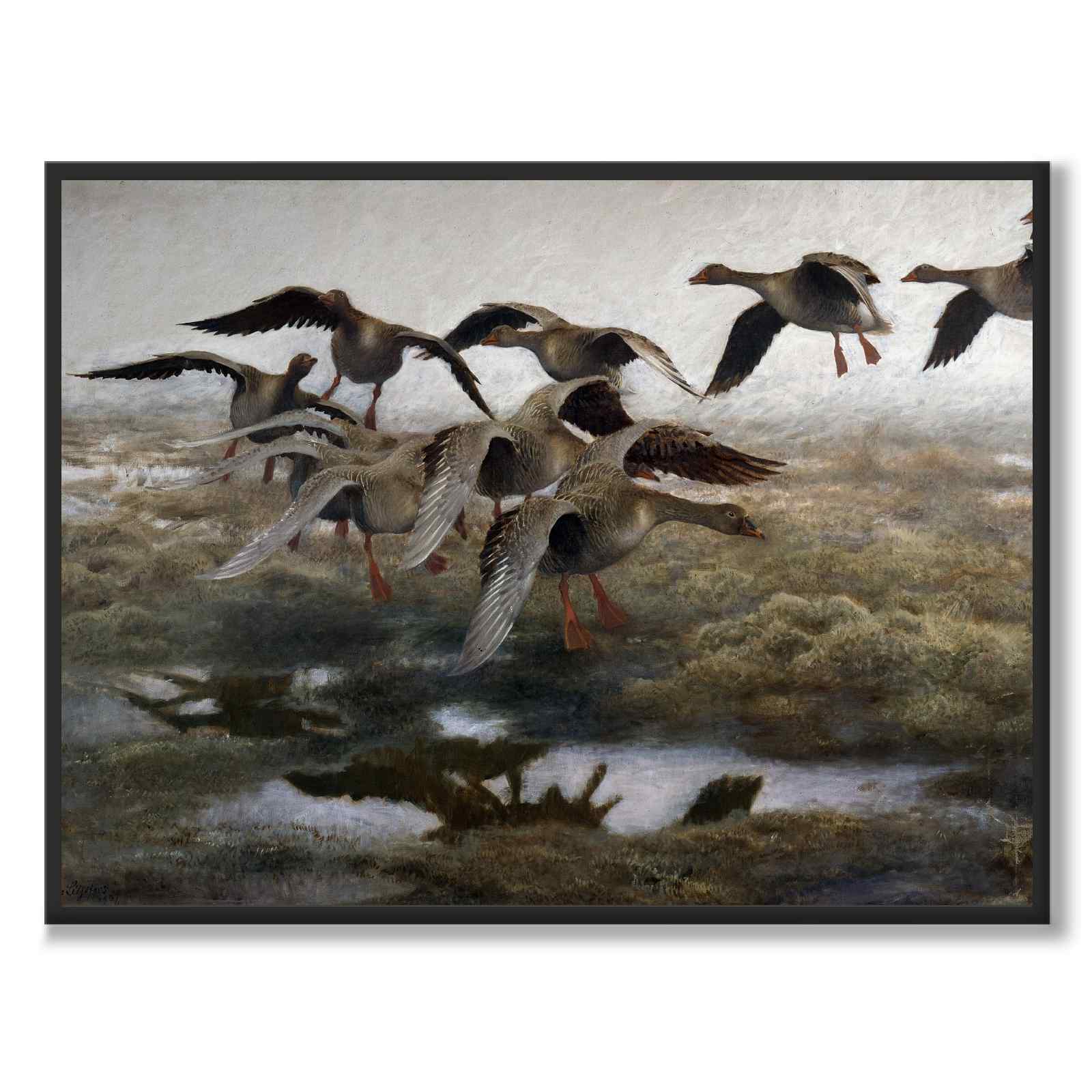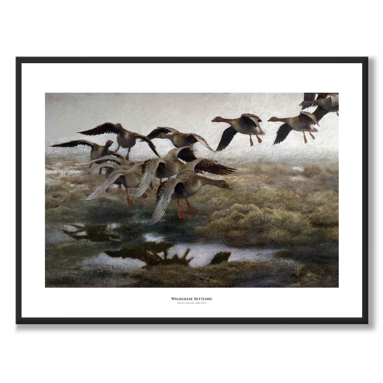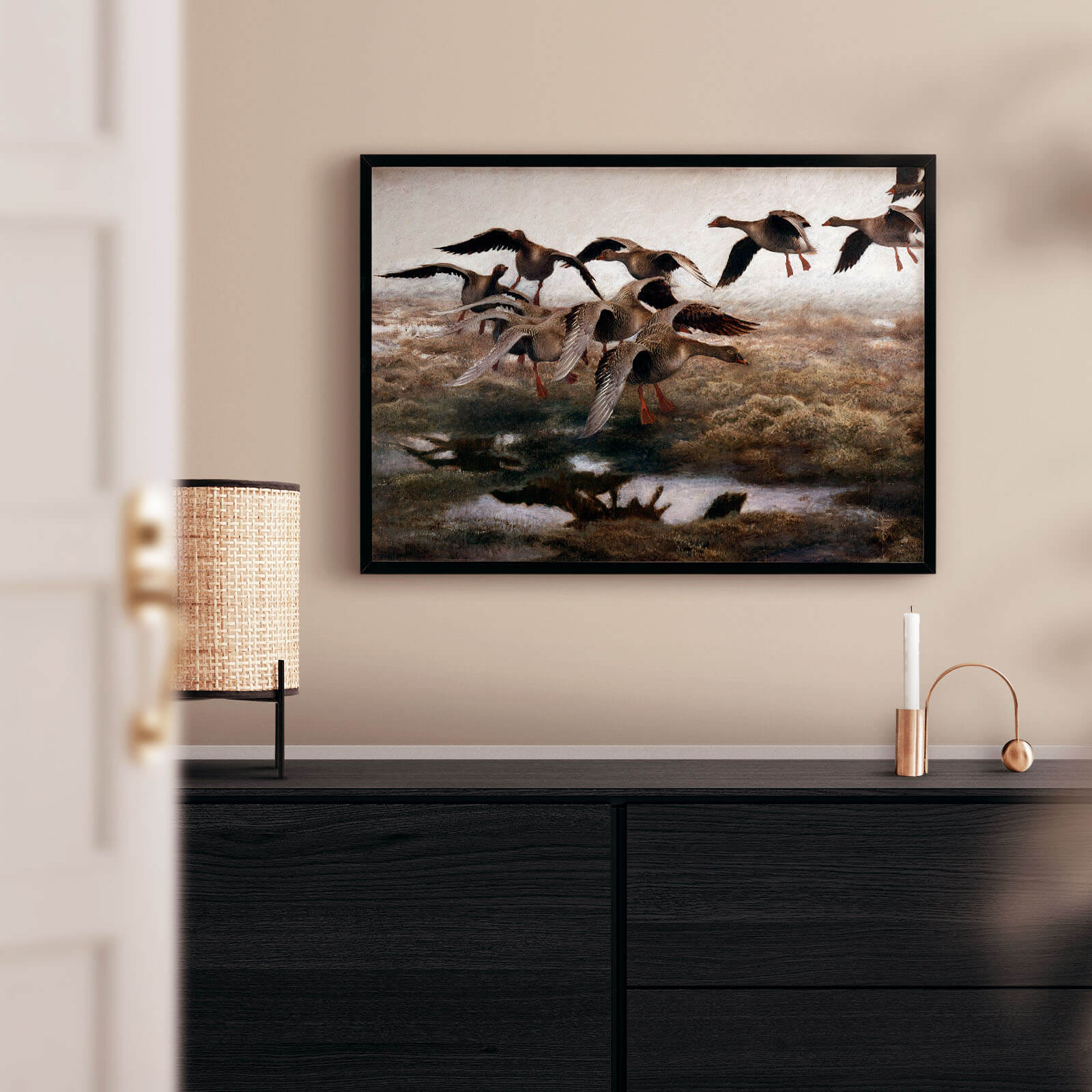 Plakat med et vakkert maleri fra 1907, malt av Bruno Liljefors. Motivet viser en flokk med villgjess som lander på en vakker myr på en tåkete dag.